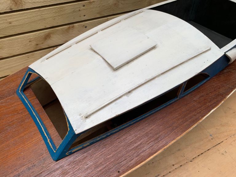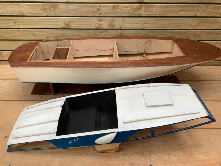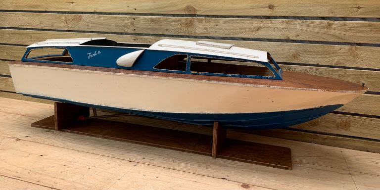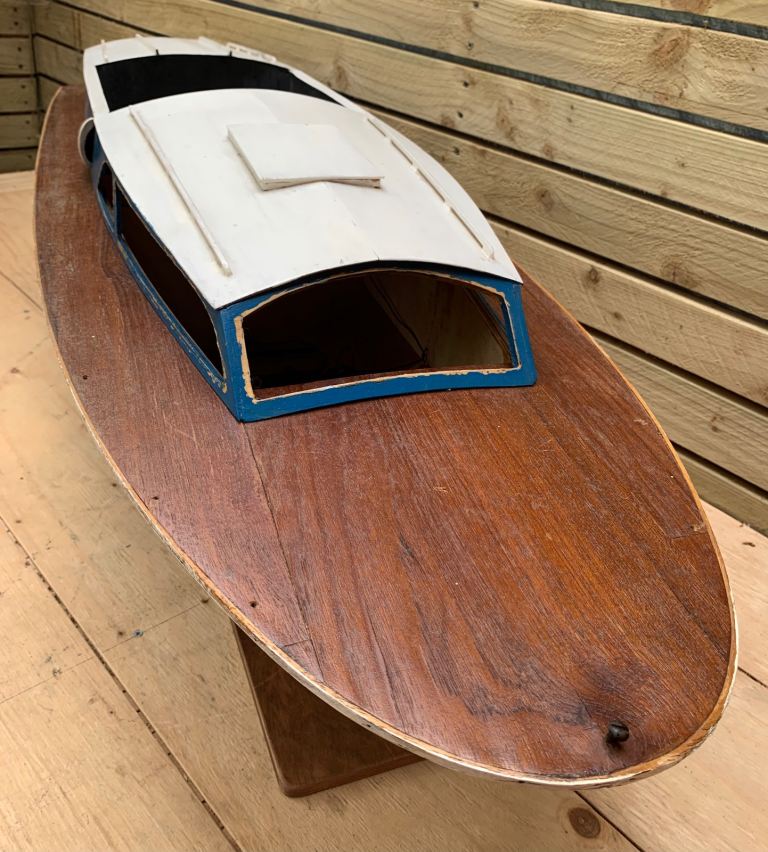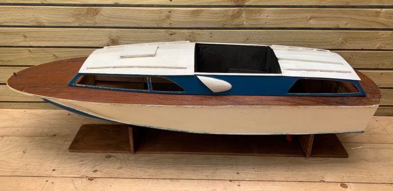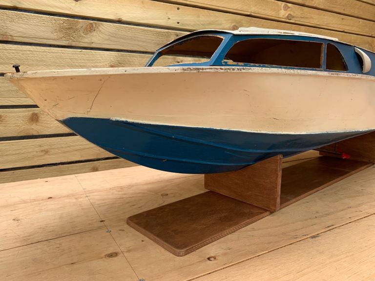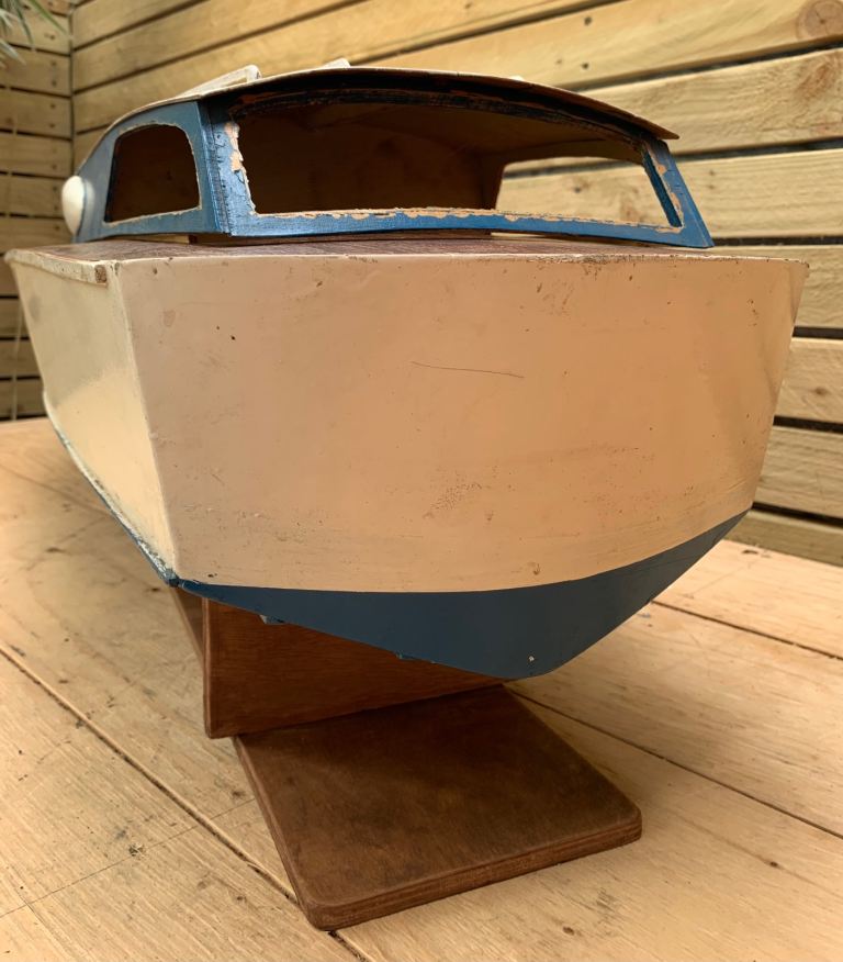 We are delighted to offer this fabulous loft find . . . A vintage scratch built model of a motor boat cruiser on stand. English in origin & hand made from scratch. Quite large in size measuring an impressive 00" in length. Mid blue painted hull, wooden top deck, white top cabin. Original internal electric motor with brass prop shaft & red plastic propeller. The cabin section lift off to reveal inner motor & hull battery compartments.