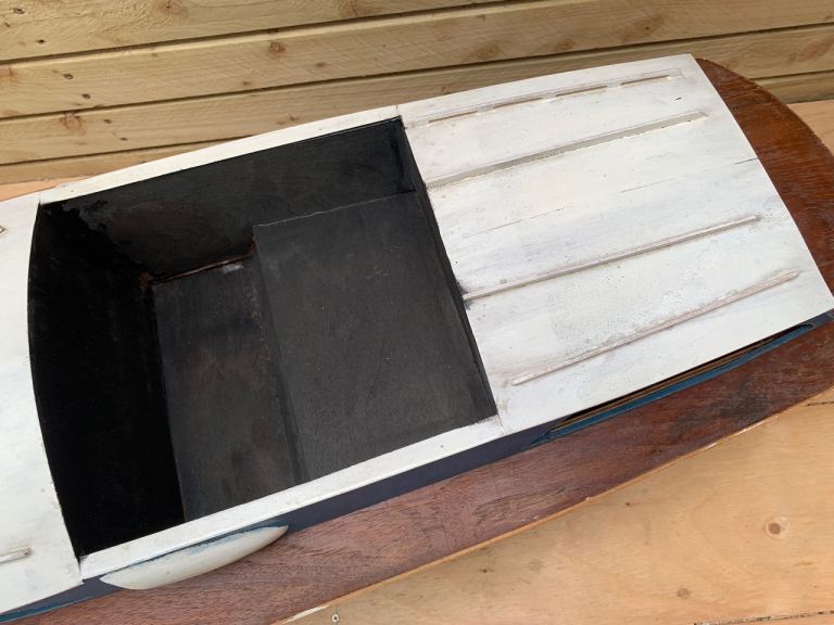 This model comes directly from a recent estate sale & is sold in lovely loft found vintage condition. It in good general order but is in need of some light repairs. It’s mainly in need of a tiller & new batteries. The tiller arm is present & battery connection leads are there. All very do able & would make for a very cool display or usable model when complete.