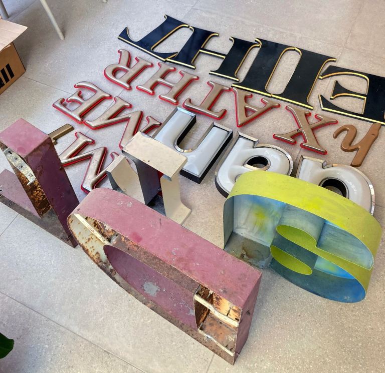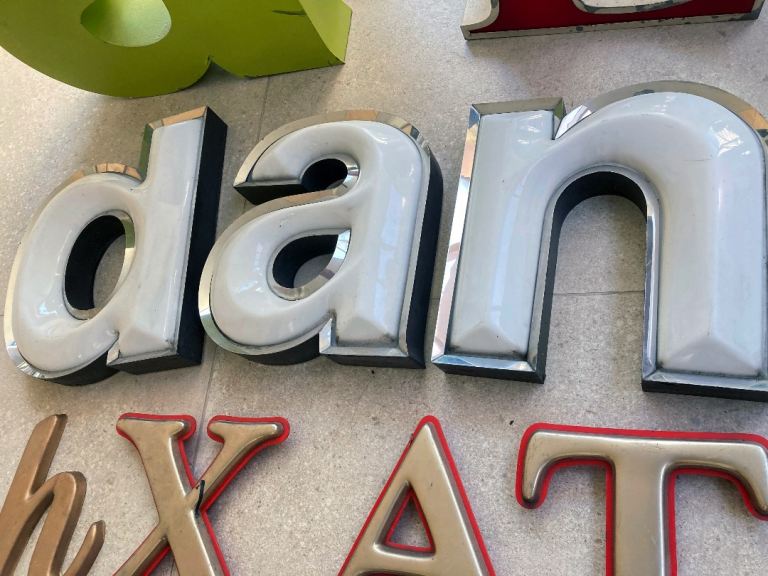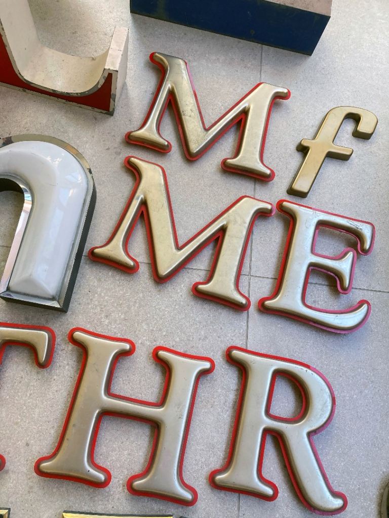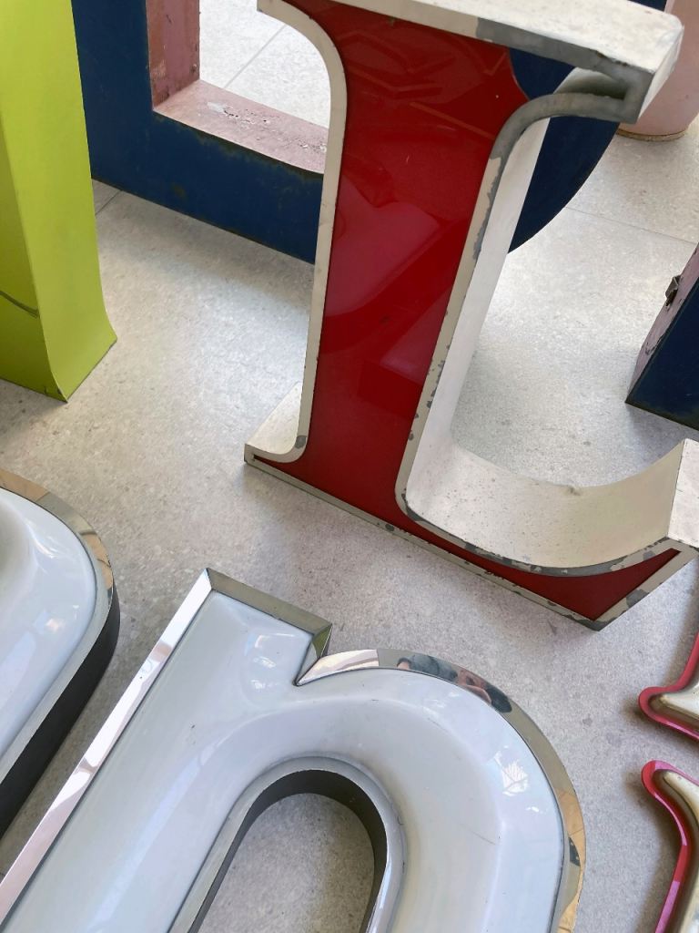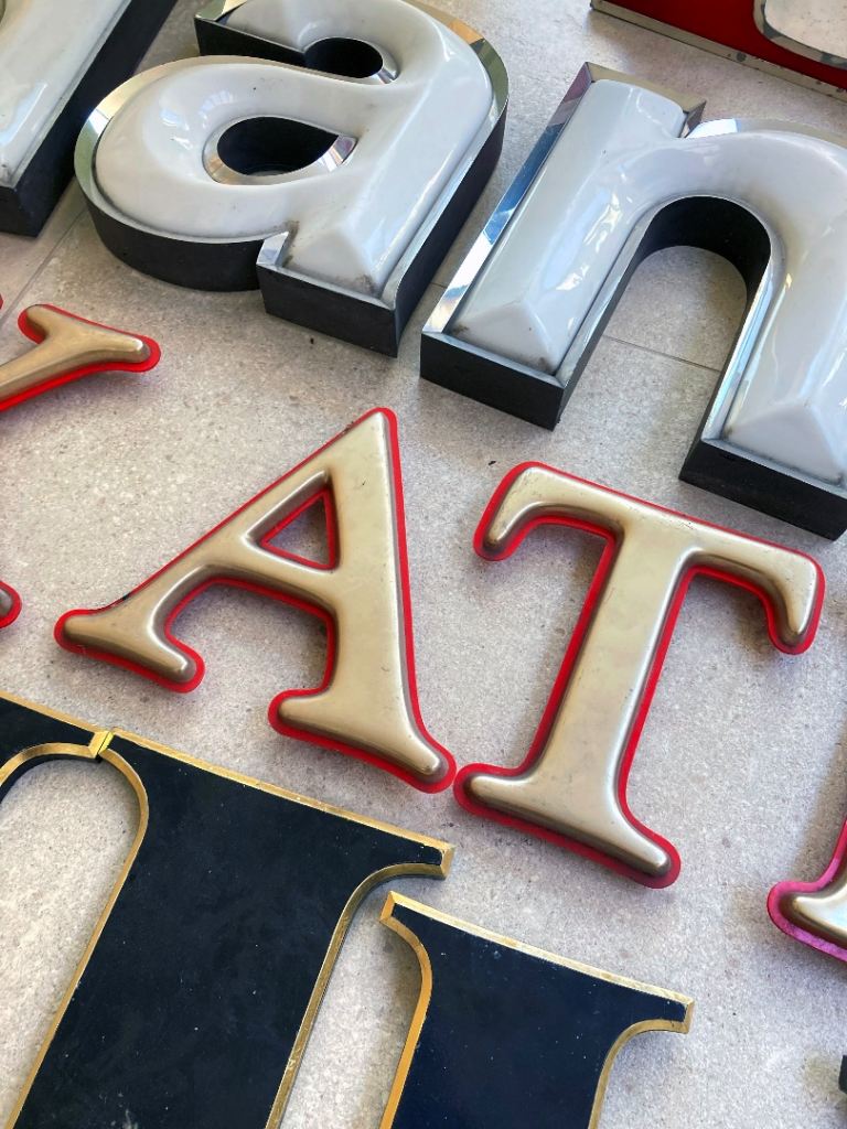 Vintage signage / letters collection. These have come from mainly London pubs (The Pavilion, The Exmouth Arms) and shops, a Brighton hotel, a fairground, and you also might recognise a few letters from a well known burger chain.