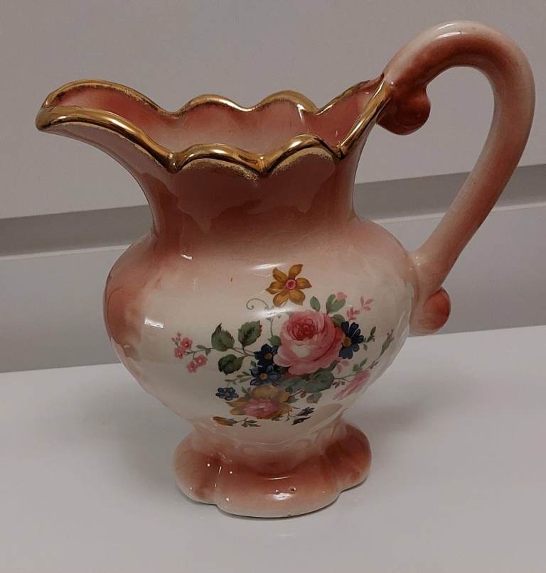 Deep pink edged Beautiful Staffordshire vintage wash bowl and pitcher. Very decorative items and would add lovely décor to a bedroom or make a perfect gift. Great condition for it's age.