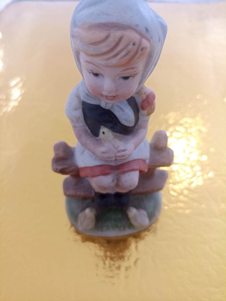vintage porcelain figurine of a young girl sitting on a fence, with two chicks at her feet.