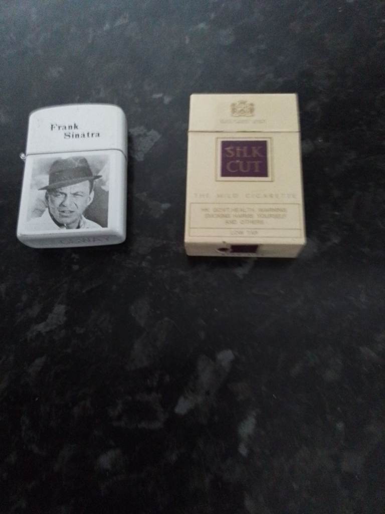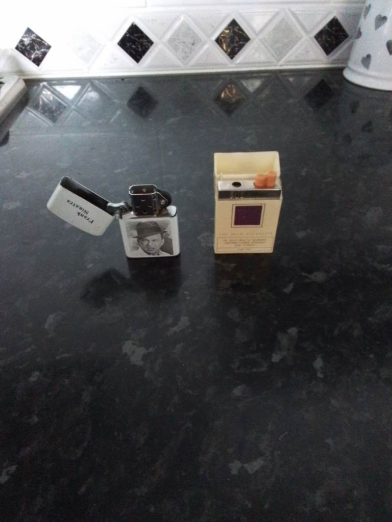 Cigarette petrol lighter Frank Sinatra photo on front. Black & White. Size: 1 1/2 x 2 1/2x 1/2 thick. Has the name Kingsway on bottom of lighter (perhaps the