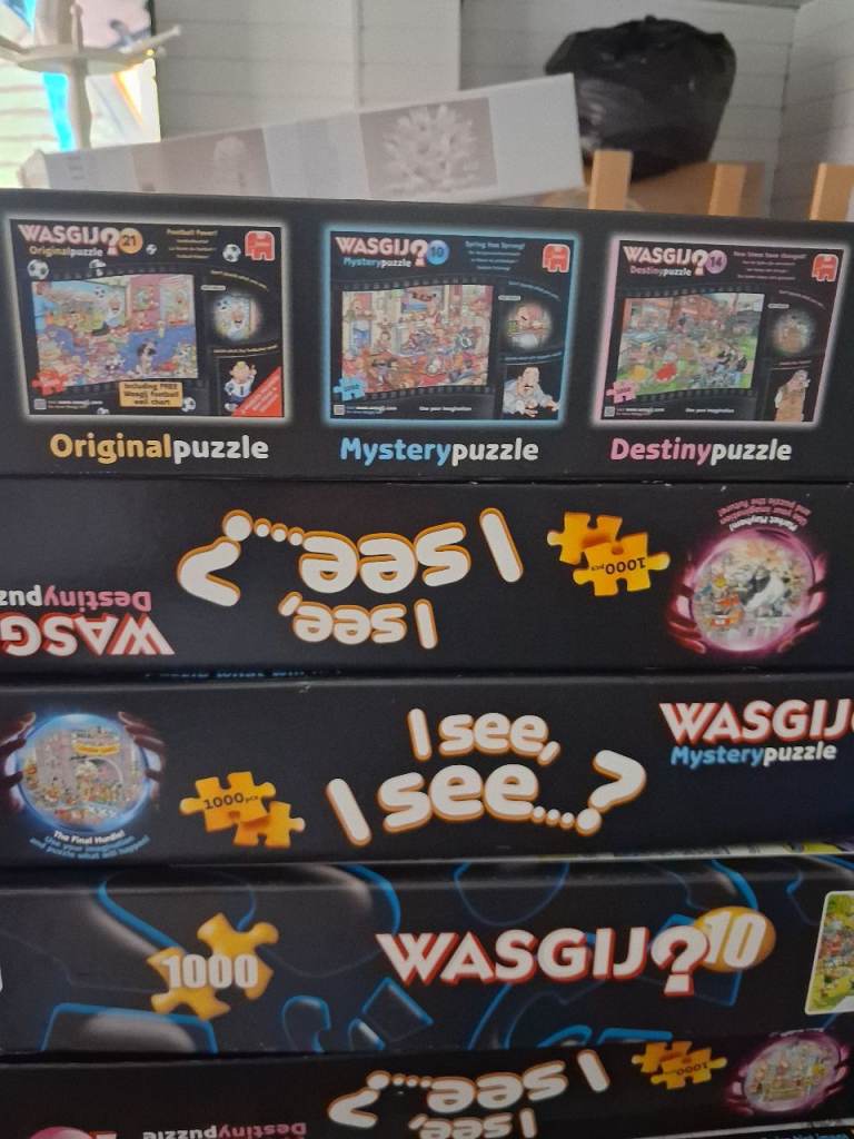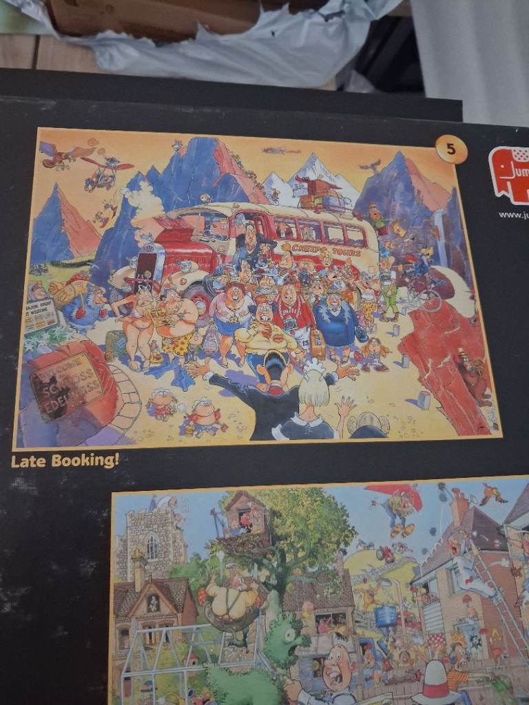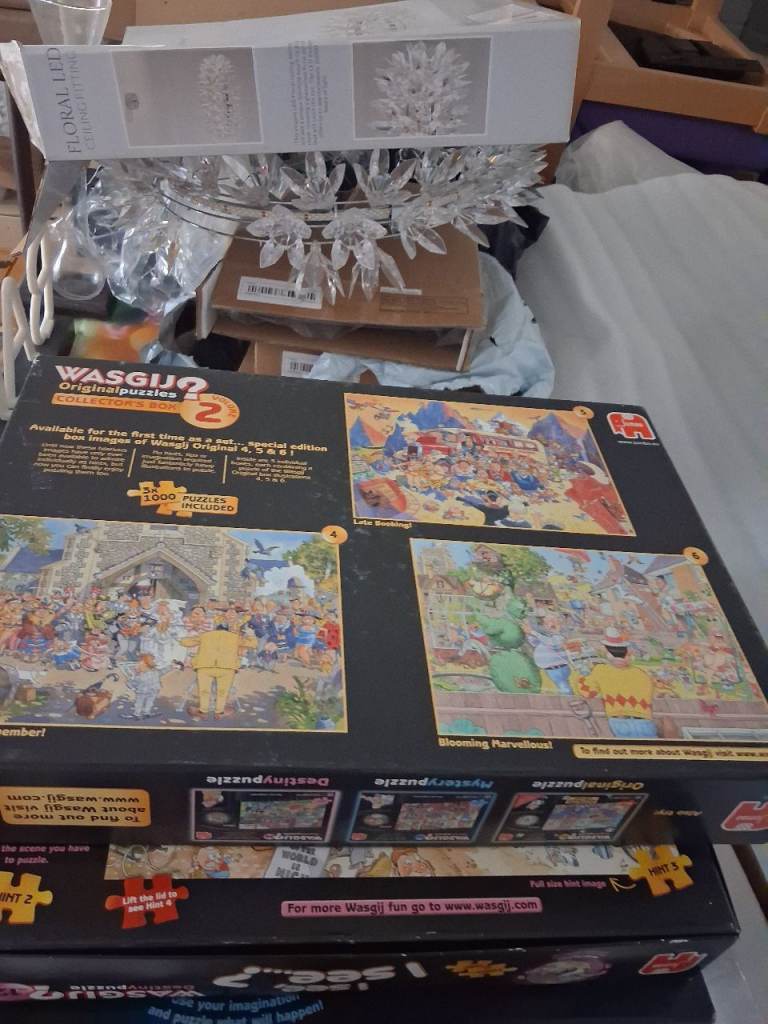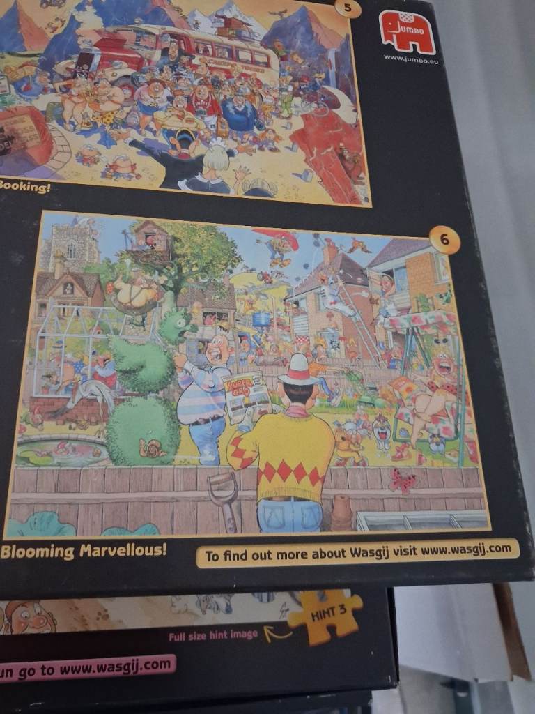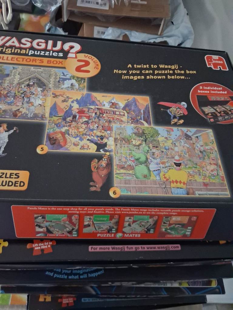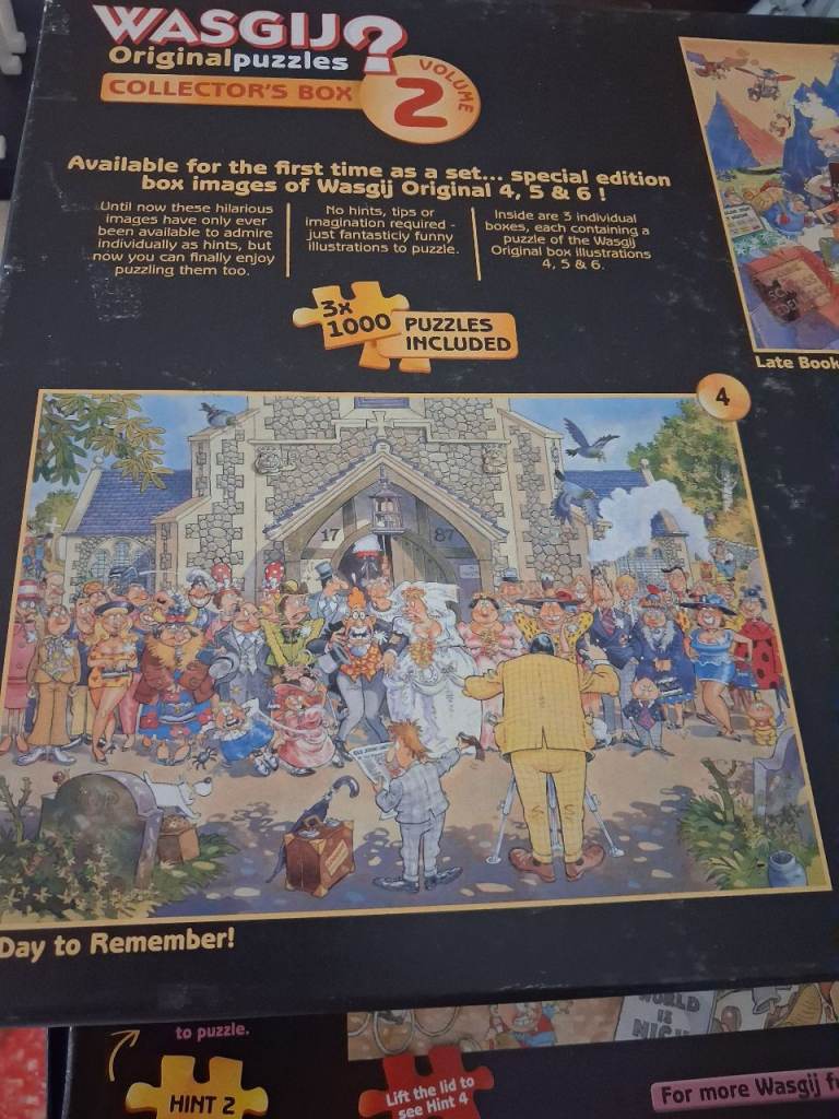 I am selling a box of 3 wasgij collectors box volume 2 original puzzles each puzzle has 1000 pieces special edition one is called late bookings and one is called a day to remember and one is blooming marvellous