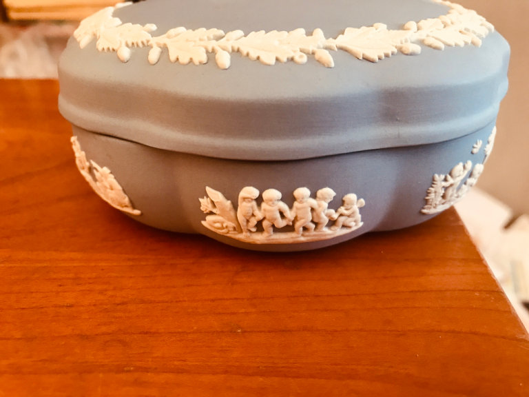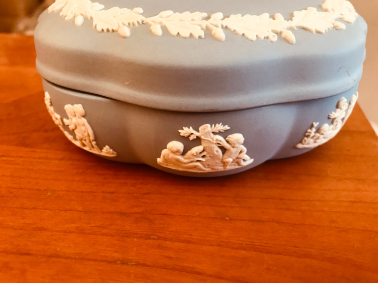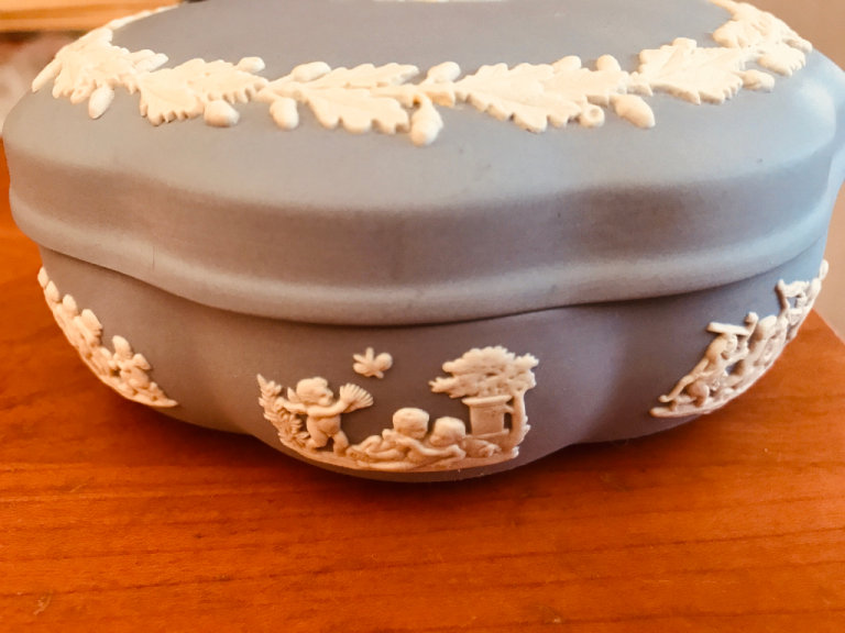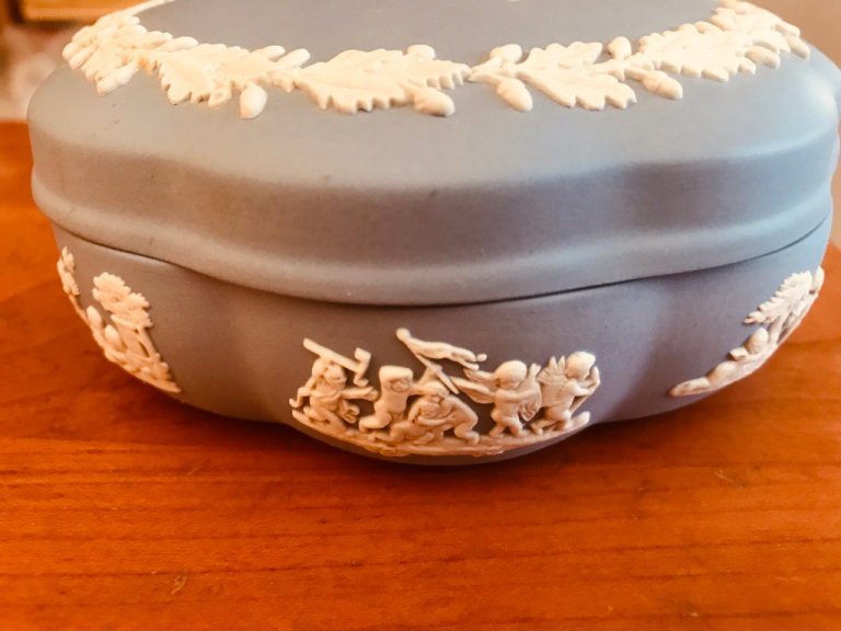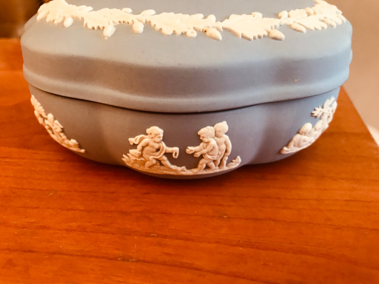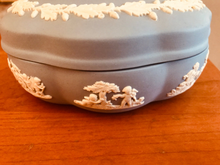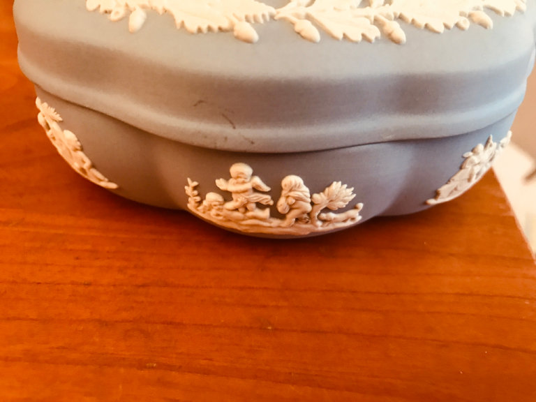 Wedgwood England octagonal scallop shaped trinket bowl (lidded) with white bas-reliefs featuring a neo-classical scene on the lid as well as eight scenes around the sides featuring cherubs/putti. White acanthus or laurel garland around the edge of the lid.