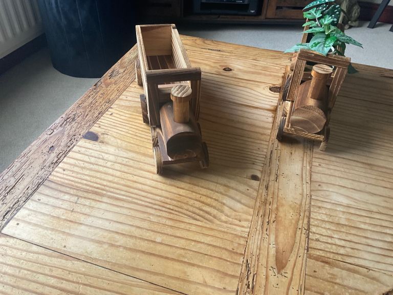 Wooden trains for sale measuring 15x6x4 inches lovely as ornament or with plants in looking for £12.50 each or would do 2 for £20