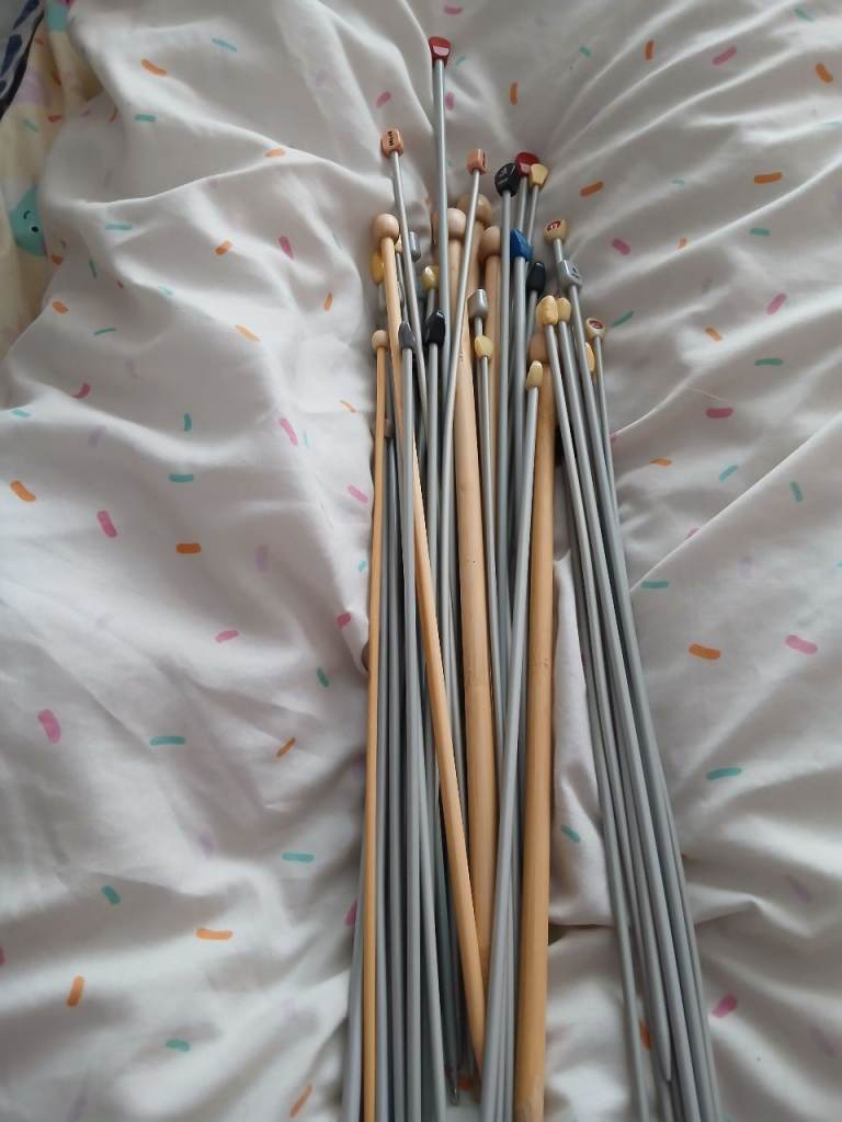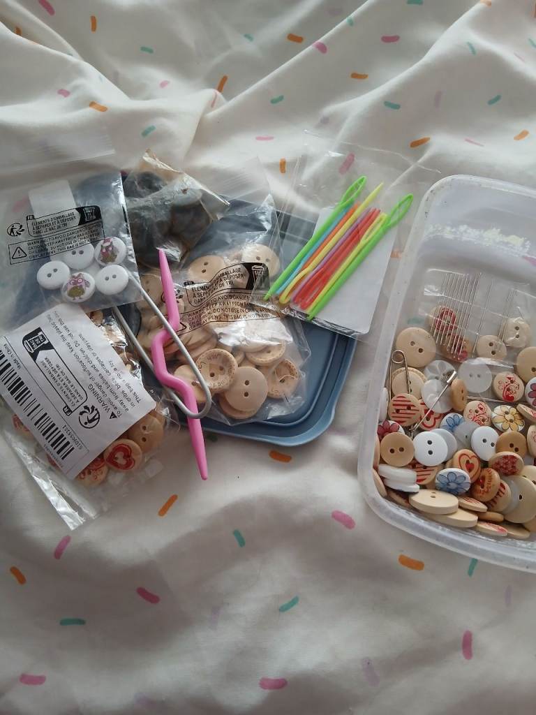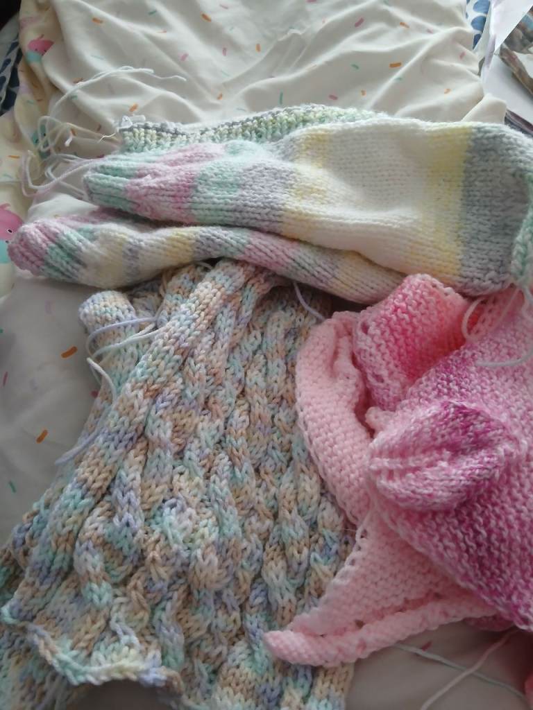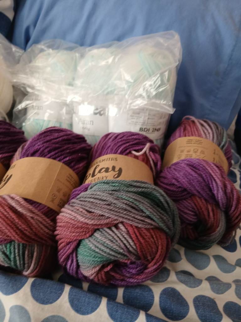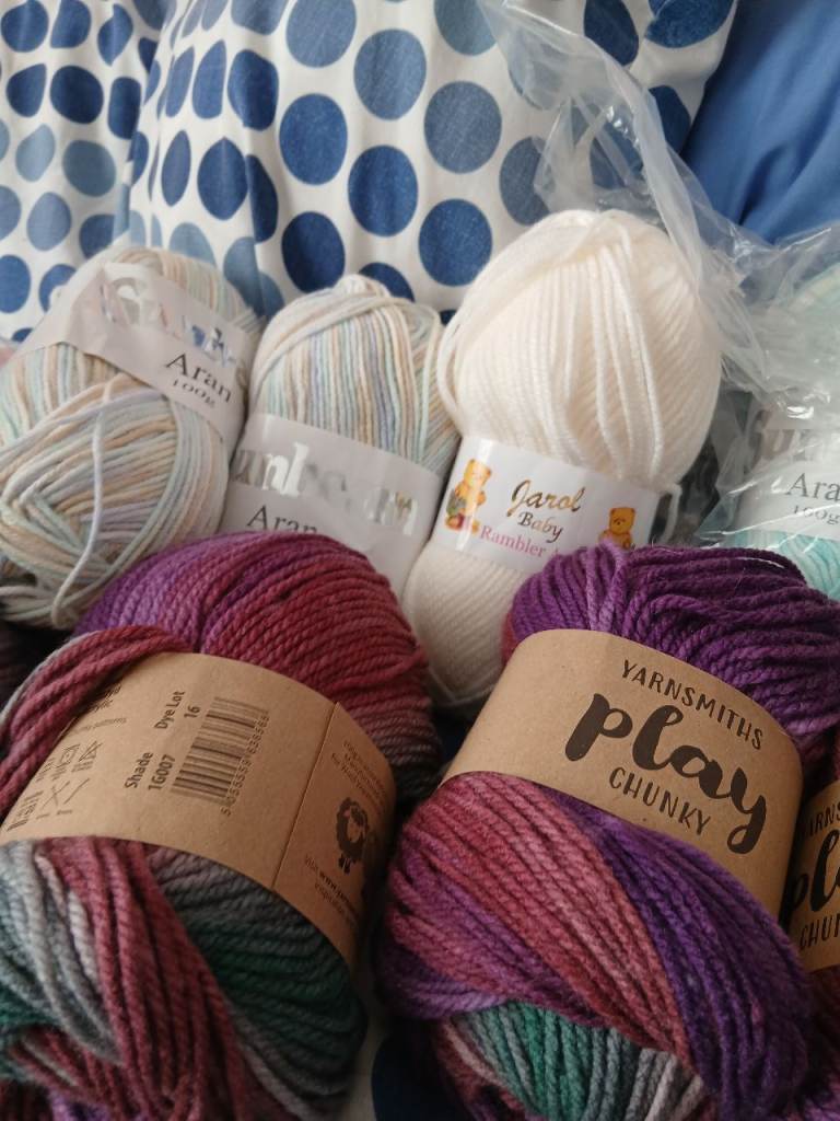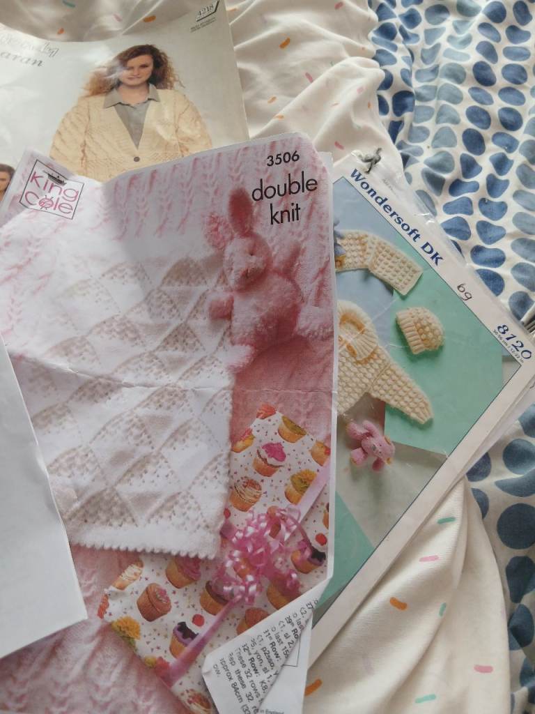Brand new wool 5 balls chunky 3 balls baby aran bag of mixed oddments needles buttons paterns 2 cardigans need finishing