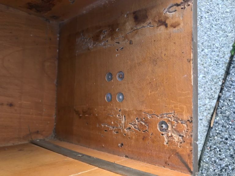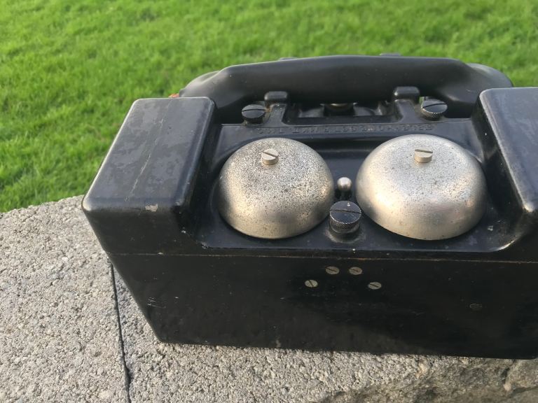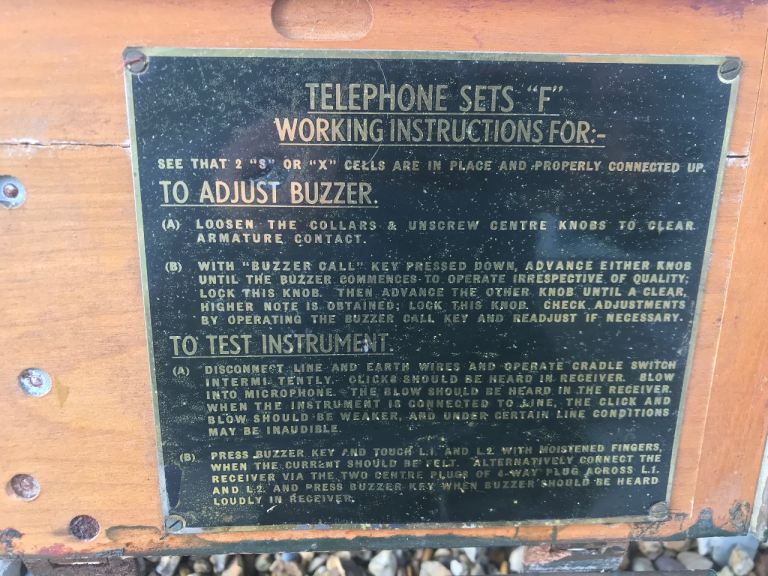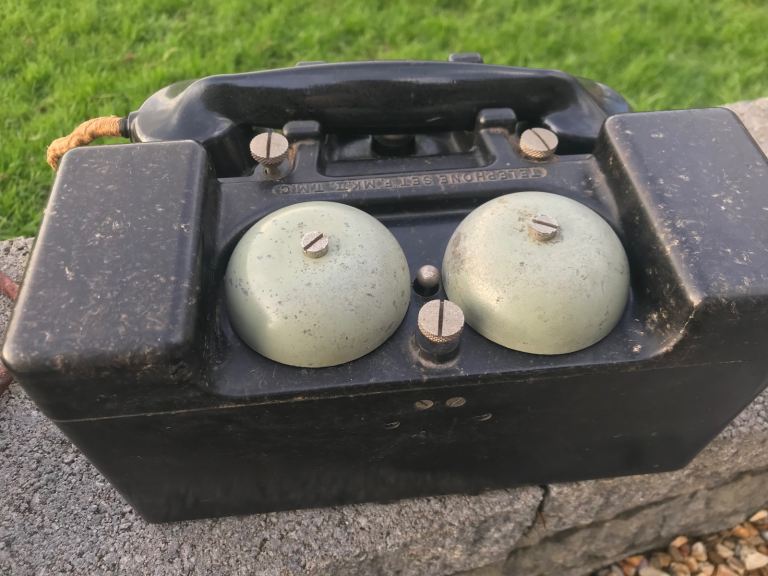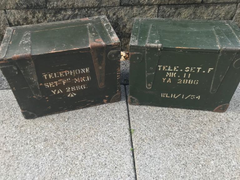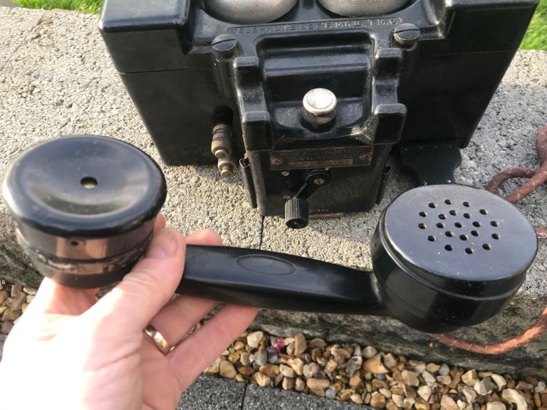 Both come with their own restored metal bound wooden cases with original stencil details. Bakelite hand sets have no damage. Very rare to find one phone with original box let alone two sets. Small area of woodworm in one side of one storage box which has been treated .