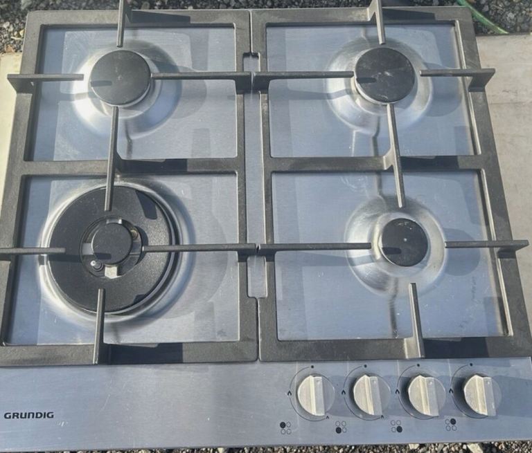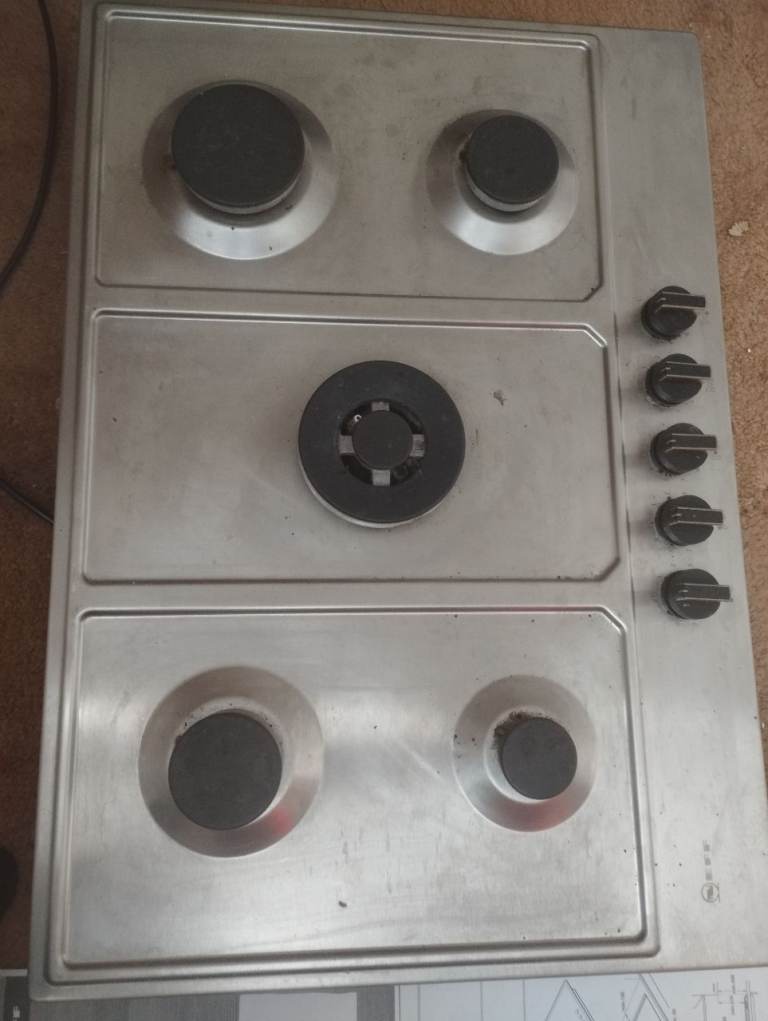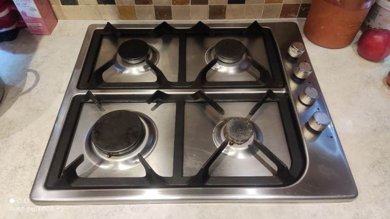 Baumatic built in four burner stainless steel gas hob showing signs of wear on bars and burners but base sound. W 585mm d 500mm.