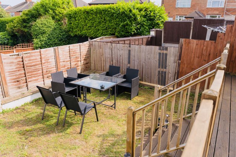 Decking area and Grass area with outdoor dining table and 6 chairs — perfect for outdoor dining or unwinding after work.