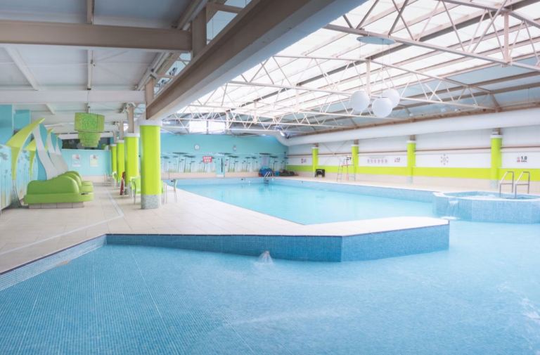 THERE IS AN INSIDE SWIMMING POOL WITH SLIDES