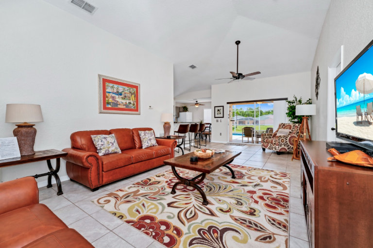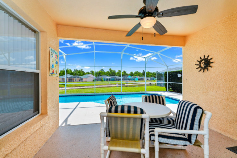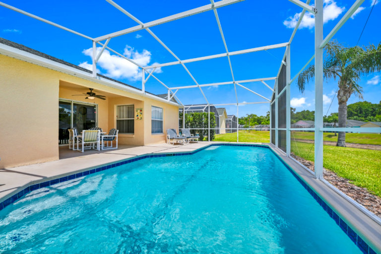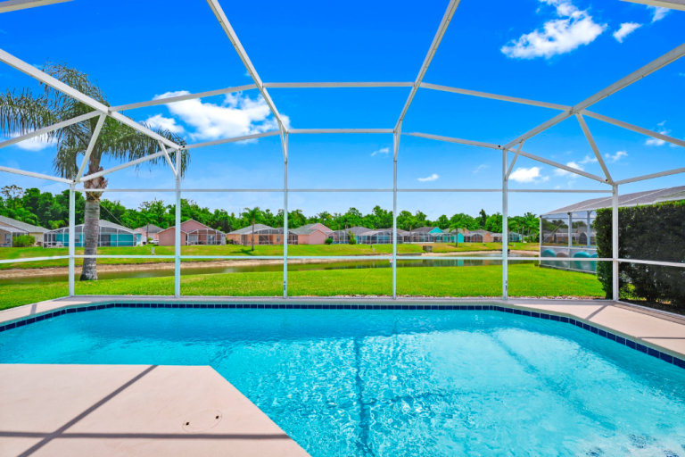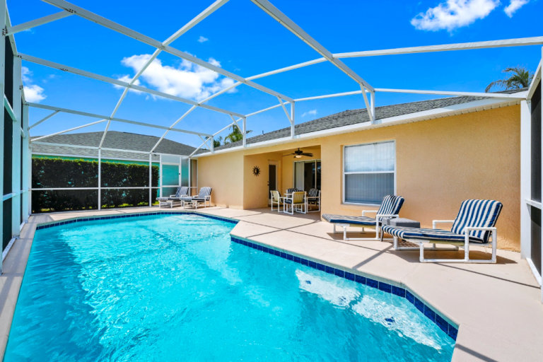 3 bed / 3 bath, comfortably sleeps six. Sunny private pool (30 ft long) that looks out over beautiful lake. With comfy loungers, covered shaded lanai, with outside seating / Dinning area.