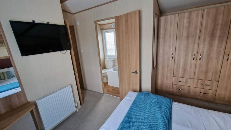 The master bedroom with kingsize bed, ensuite bathtub and smart tv.