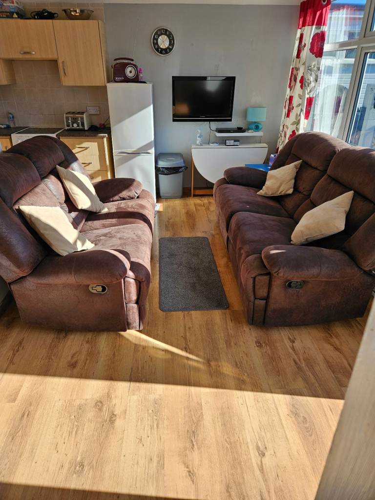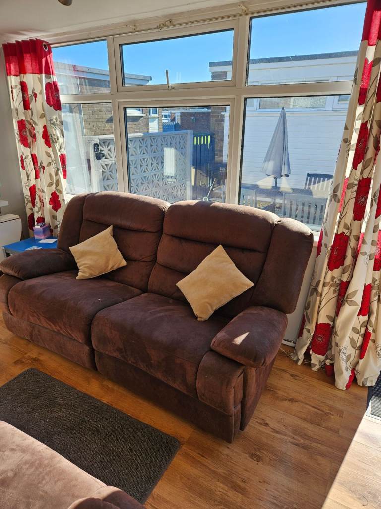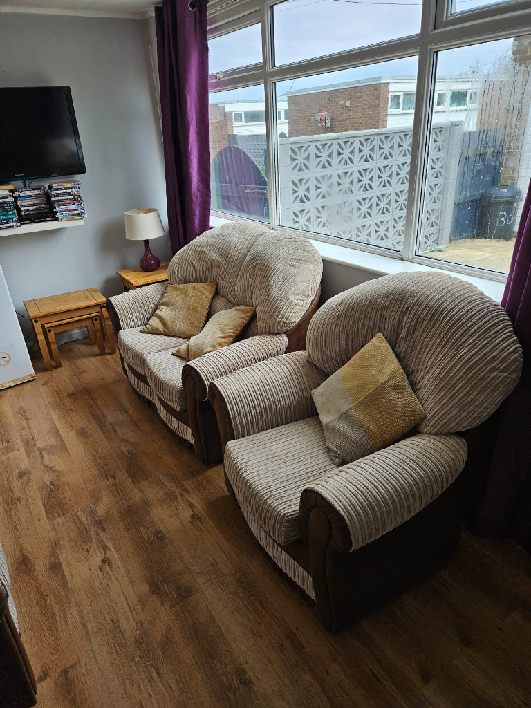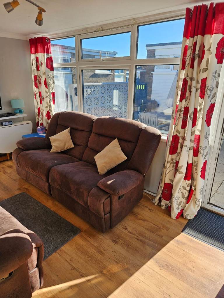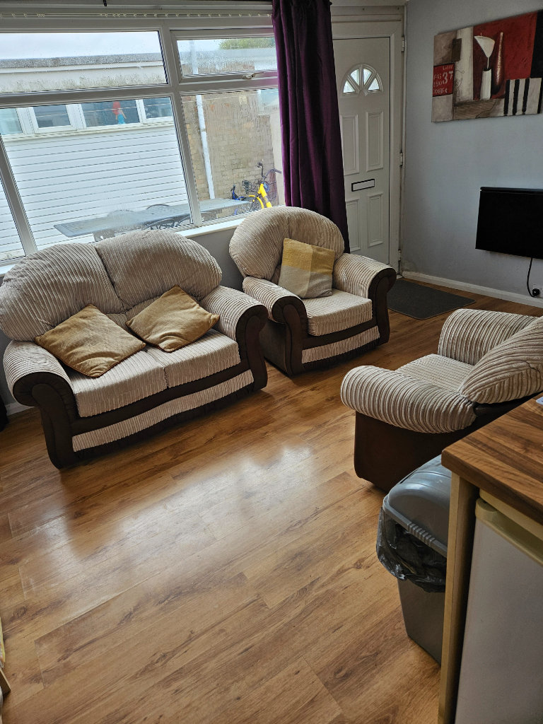 THE CHALETS HAVE A THREE SEATER SOFA & CHAIR IN THE LOUNGE AREA WITH A FLAT SCREEN TV WHICH IS SET UP WITH FREE VIEW