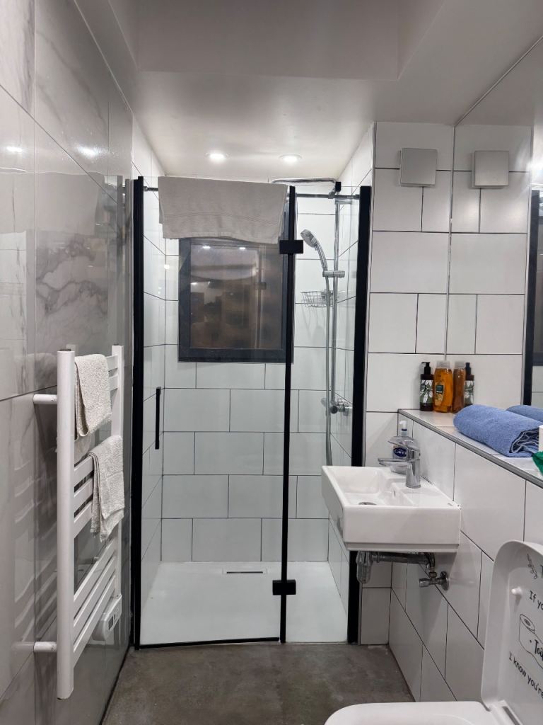 • Contemporary bathroom with walk-in shower. Clean, calm, boutique-style finish throughout