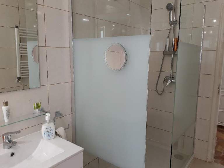 Bedroom 1 Super King ensuite bath and shower with patio doors to pool terrace