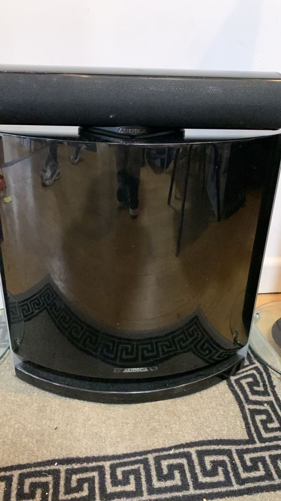 Audica surround sound system with two speakers and amp in excellent condition