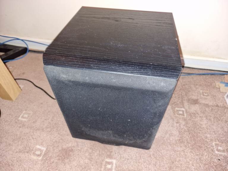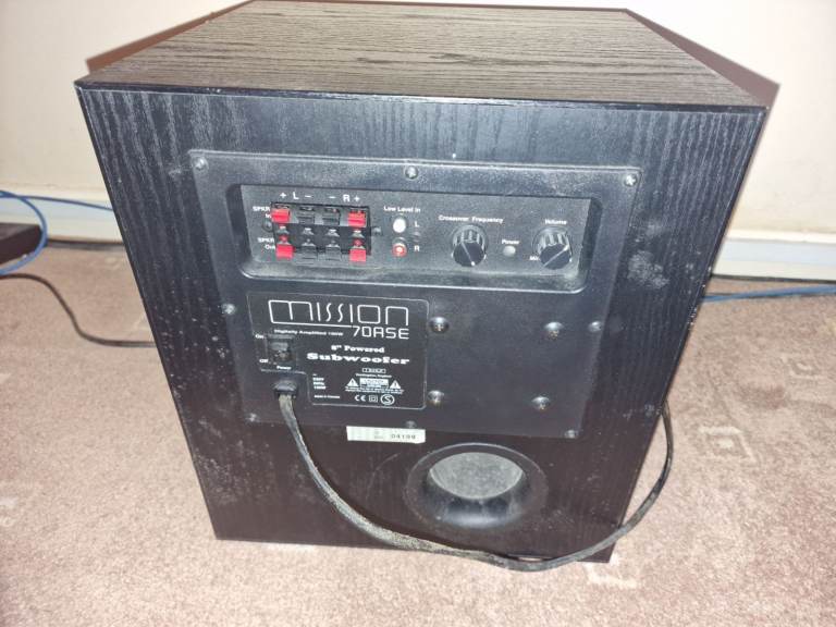 Mission 70ASE Subwoofer speaker still working well, lightly used if a little dusty. 100W max output from internal amplifier. High level and low level inputs. Crossover frequency variable 50 Hz to 150 Hz. Size is about a 13 inch cube. Collection only will not post as it is quite heavy (about 12 Kg).