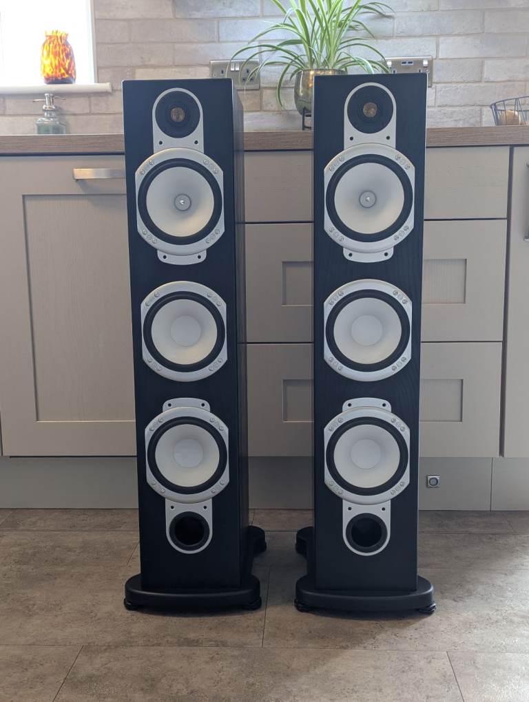 For sale I have a Mordaunt-Short Alumni 5 HiFi centre speaker – 15 – 80W in a black gloss finish with stand and cover (small pull in cover fabric, not noticeable when on – see photos).