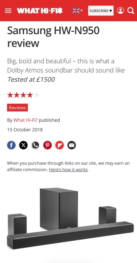 Amazing sound full atmos surround sound. Great for movies and sport.