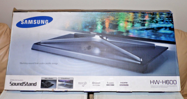 SAMSUNG HW-H600 80W BLACK WIRELESS SOUND STAND SURROUND SOUND BLUETOOTH BOXED POWER LEAD INCLUDED REMOTE NOT INCLUDED AS OUR TV REMOTE WAS COMPATIBLE BUT VERY CHEAP ONLINE RECENTLY PURCHASED NEW BUT JUST UPGRADED AGAIN, MINT LIKE NEW CONDITION IN BOX