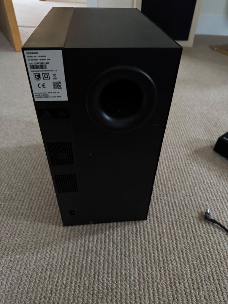 Samsung soundbar with wired subwoofer to enrich your viewing experience with impressive sound and bass. With 2.1 channel surround sound that immerses you in the action, and game mode to amplify your gaming experience. Scene by scene AI optimised sound. Bluetooth wireless sound connection to your TV. Includes wall-mount kit, and One Remote Control for your Samsung television and sound device.