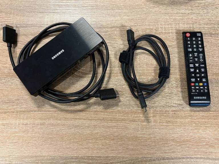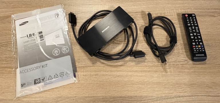 Comes with manual, remote, mini-connect box/cables, power cable and stand.