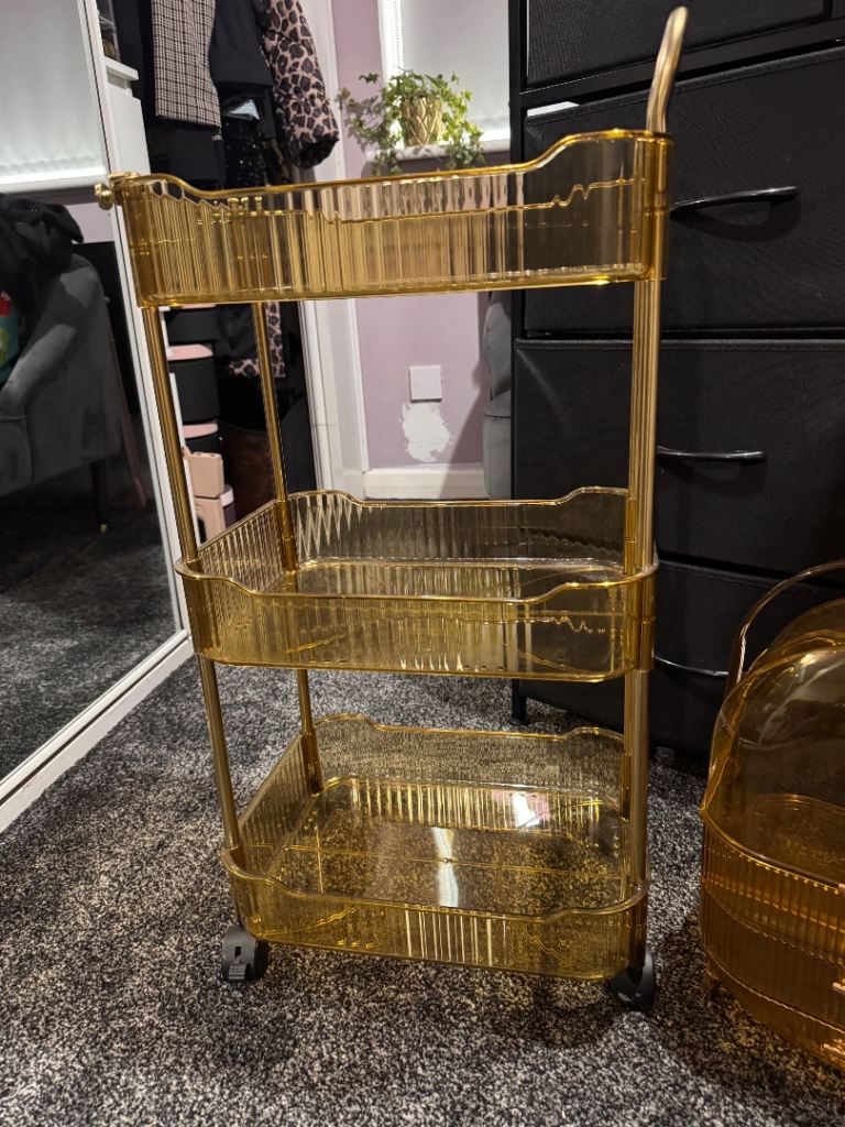 Makeup/skincare/beauty/bathroom storage items, 3 tier trolley shelves & small drawer unit in matching amber colour