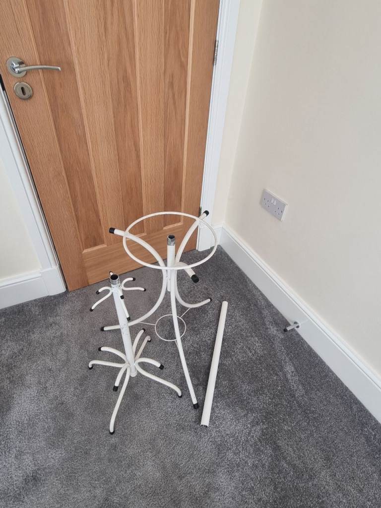 White painted metal coat/Hat stand. Approx 170cm. Breaks into 3 pieces for transporting & storage. Buyer collects. Cash only.