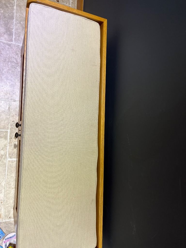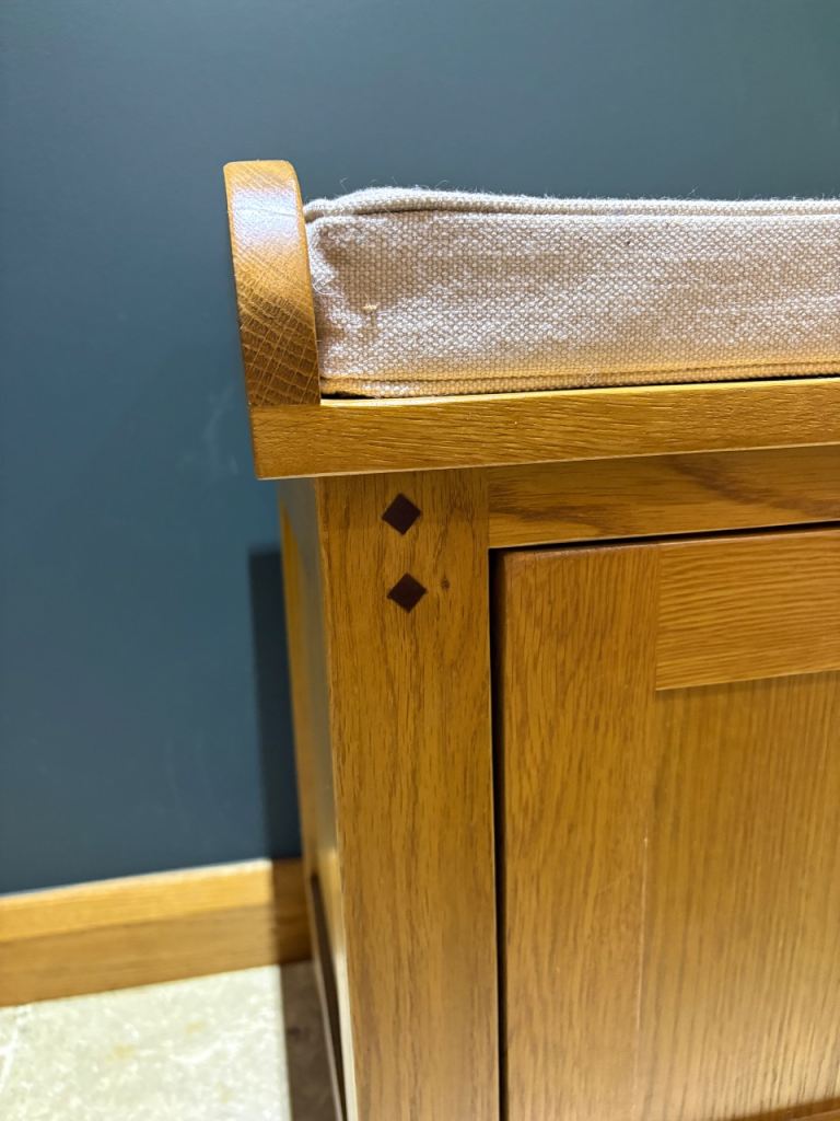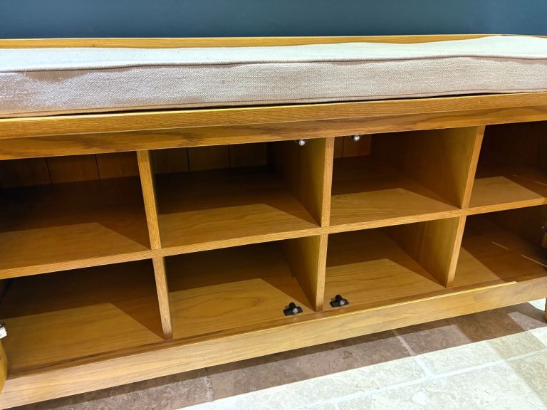 Beautiful solid oak hallway bench with shoe storage. Not a mark on the wood, pad shows a few tiny marks. From a pet and smoke free home.