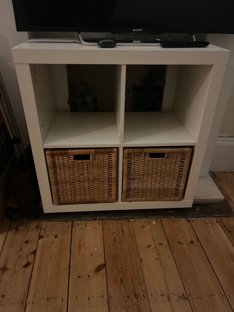 2x 4 by 4 white ilea kallax cube units with 6 cane baskets