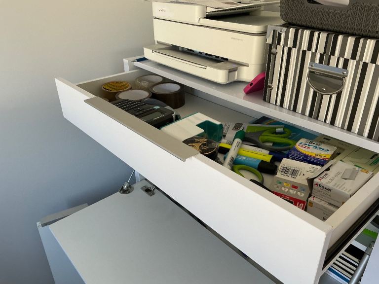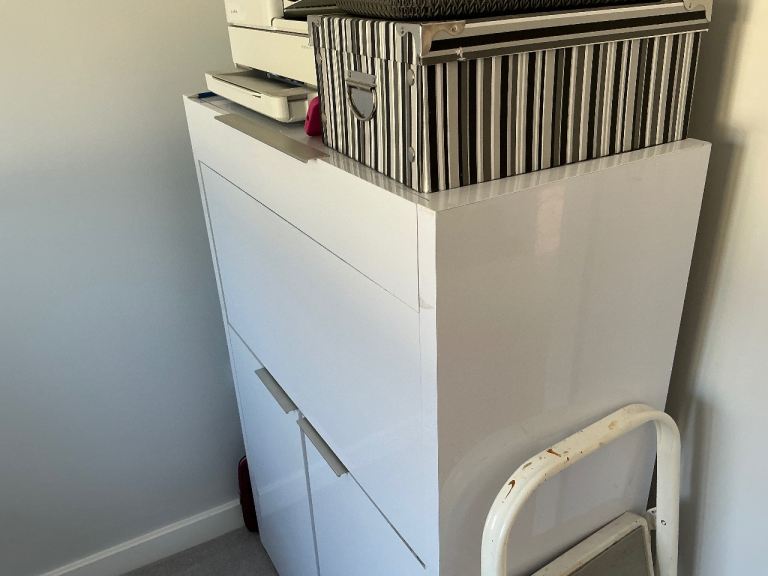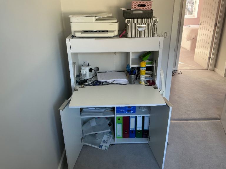 Compact white storage cabinet Desk with multiple compartments. Desk folds away ideal for working from home or child s room to do homework Size is 75cm wide 40cm depth 120 high Cost £400 new In white gloss good condition very heavy so 2 people and suitable vehicle or van to collect needs collecting from first floor bedroom