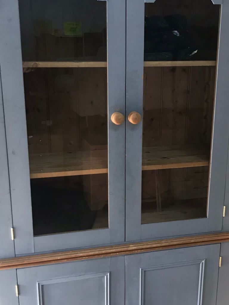Display cabinet, good quality painted pine. modern grey colour, glazed top storage cupboards beneath. good solid practical furniture. 78 inches total height, 44 inches width. possible local delivery bargain 75 pounds.