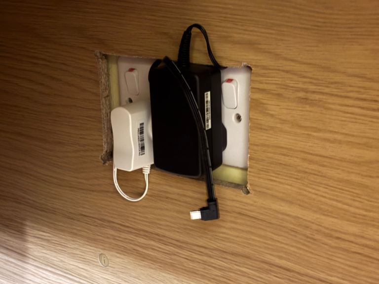 There is a small hole cut out at the back for a socket, but it's not visible when doors are closed.