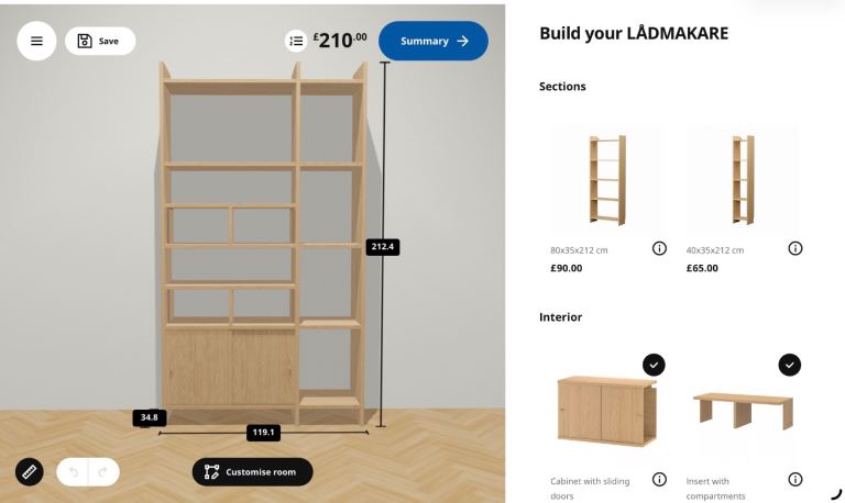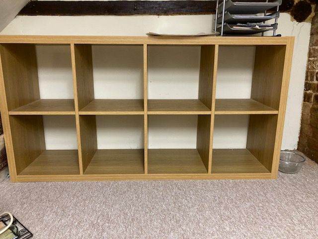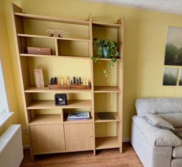 IKEA storage combination with sliding doors and shelves. Oak effect finish.