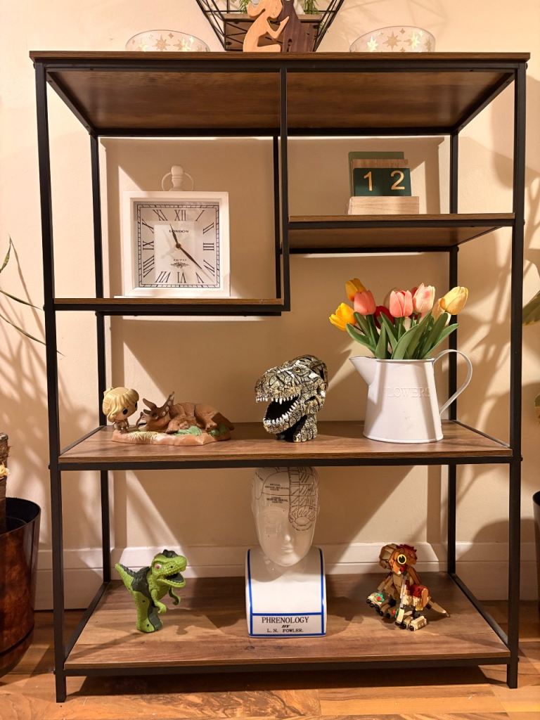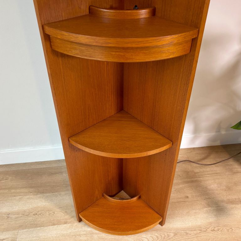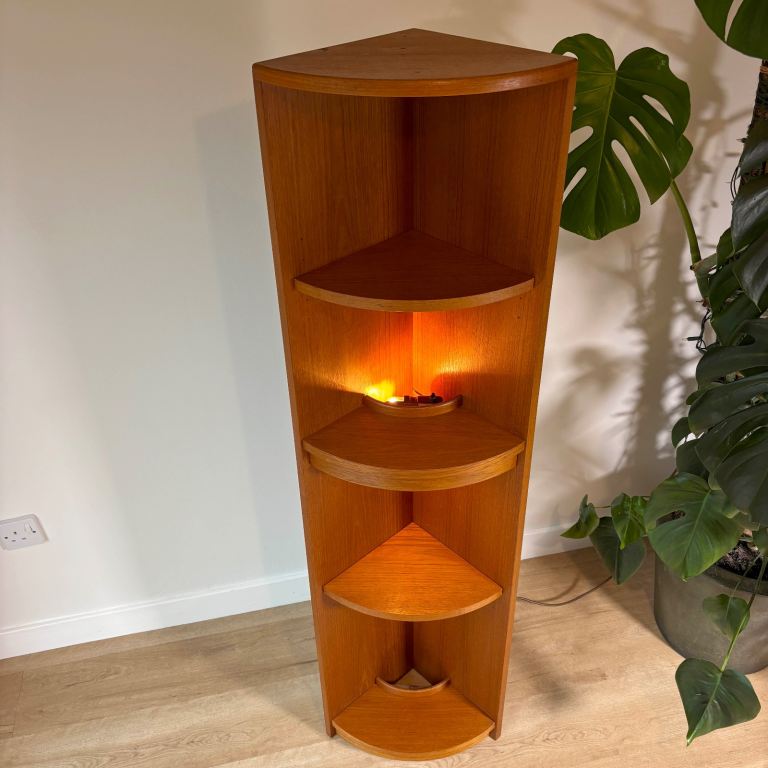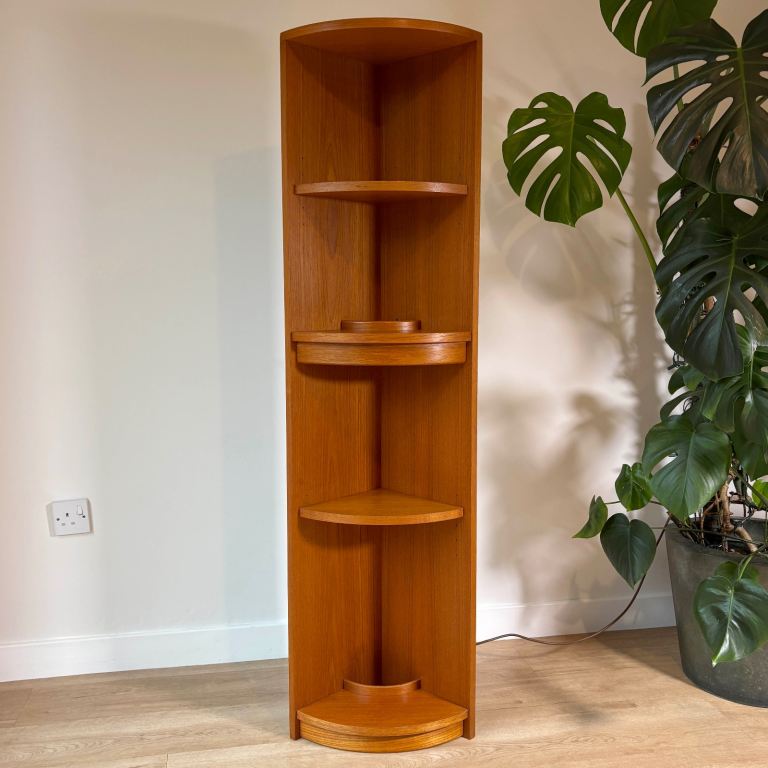 This gorgeous teak corner shelf unit with 4 shelves (two of which are height adjustable) can either sit on the floor or be wall mounted, and it will bring a touch of classic mid-century style to any corner of a room. It has just been cleaned and refreshed with a coat of teak oil.