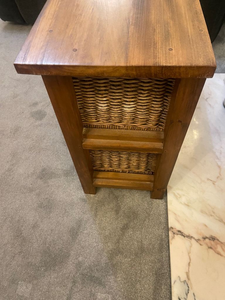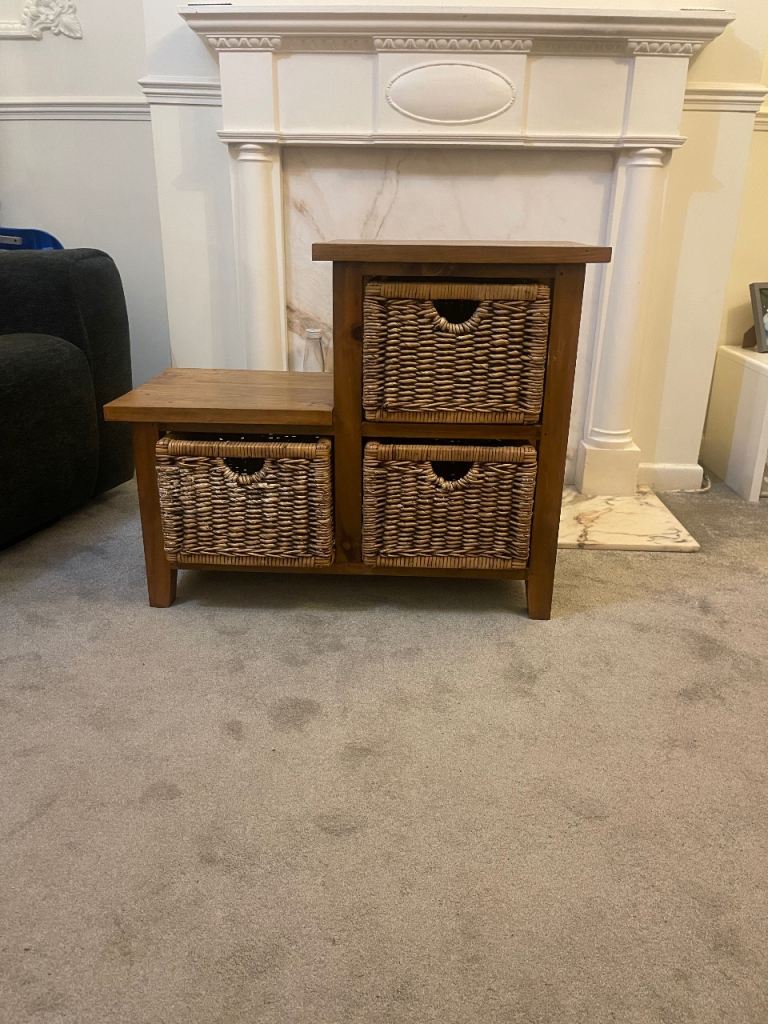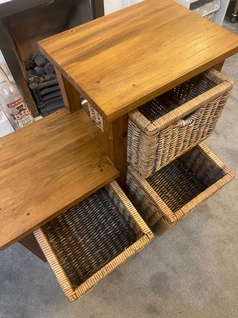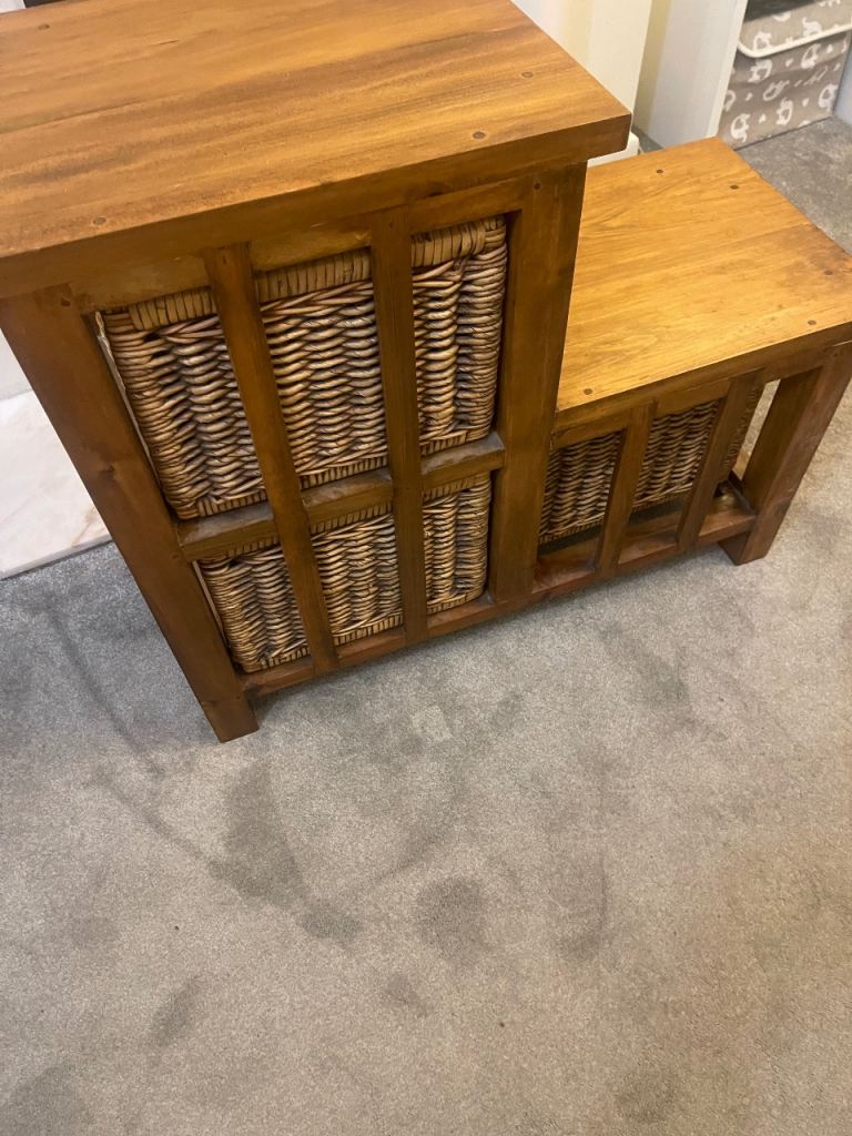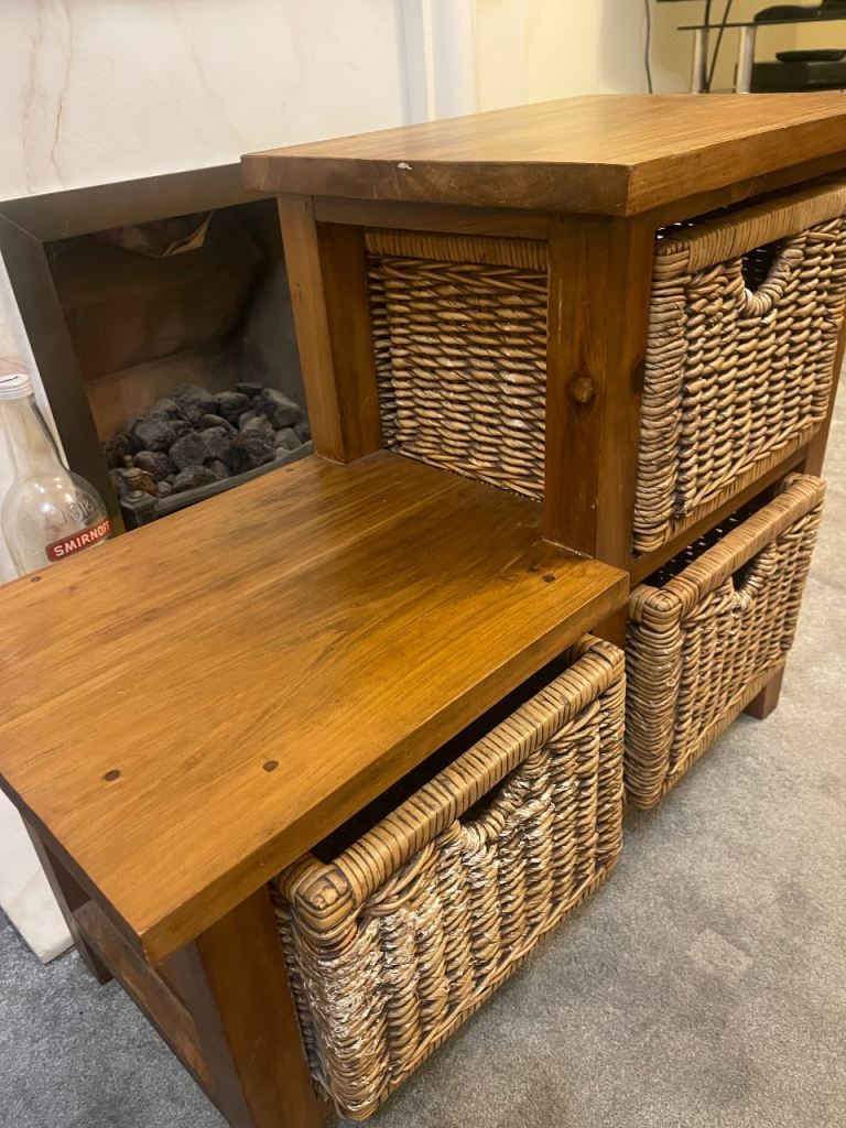 Solid Oak stepped storage unit with 3 x wicker baskets in very good condition