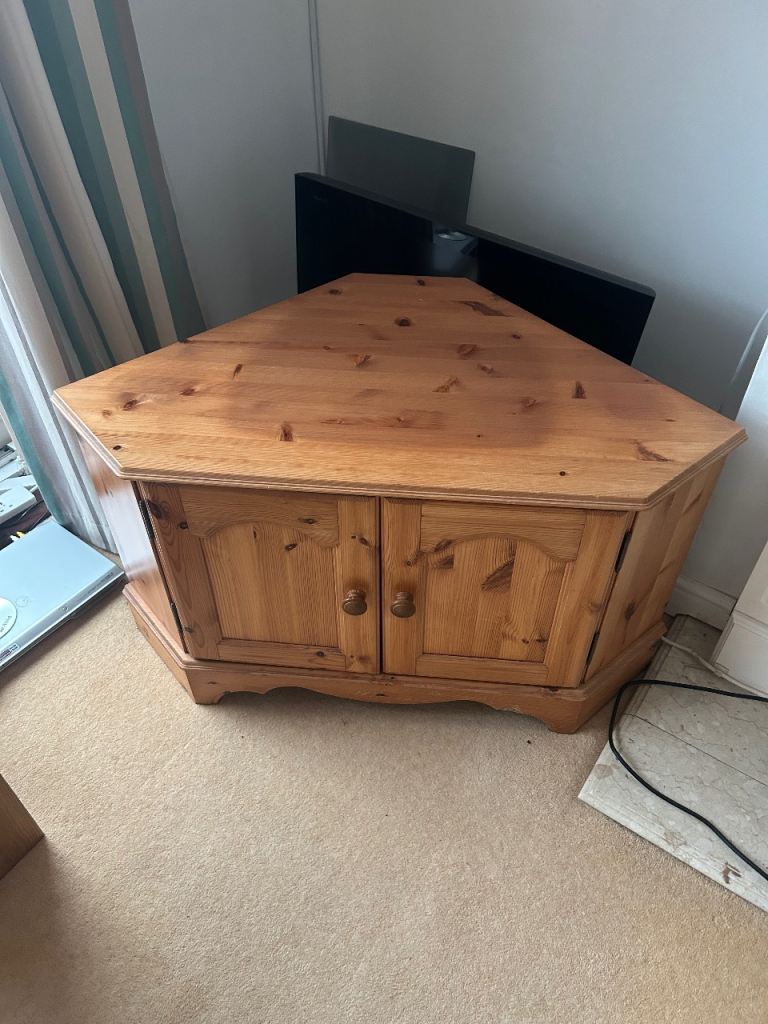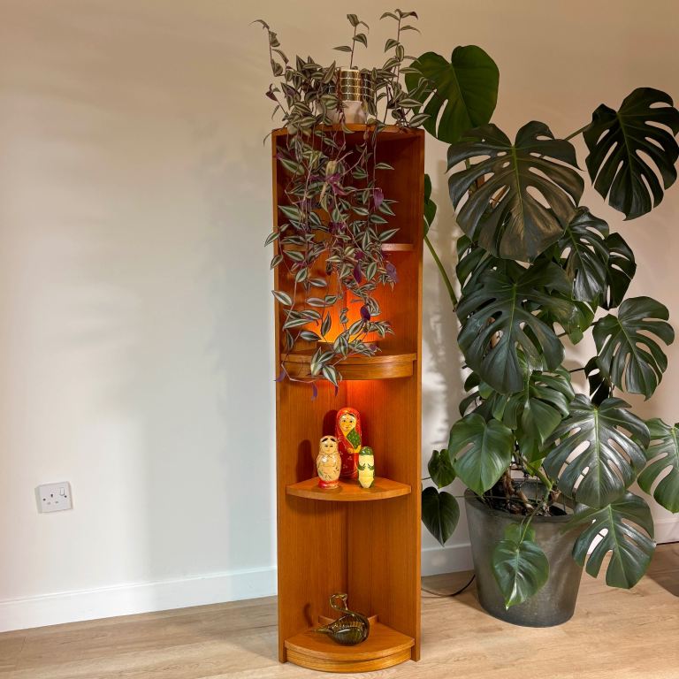 Posting for 9+ yearsTall, brown, glass-fronted corner cabinet