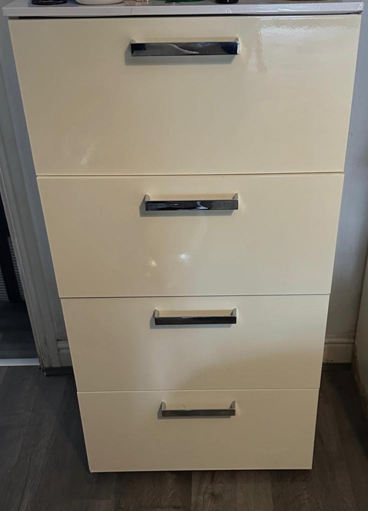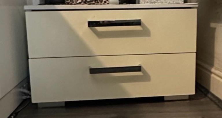 Three white glossy bedside drawers in great condition. Modern, sleek design with good storage. Perfect for any bedroom.