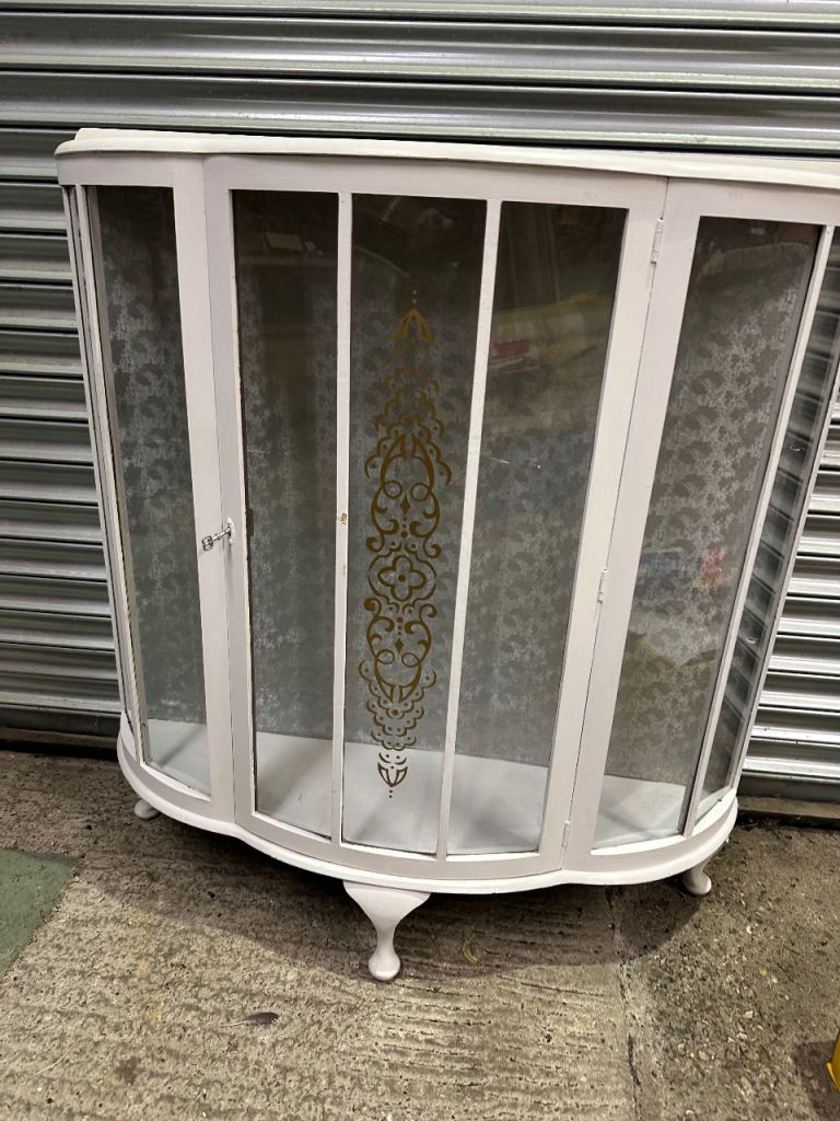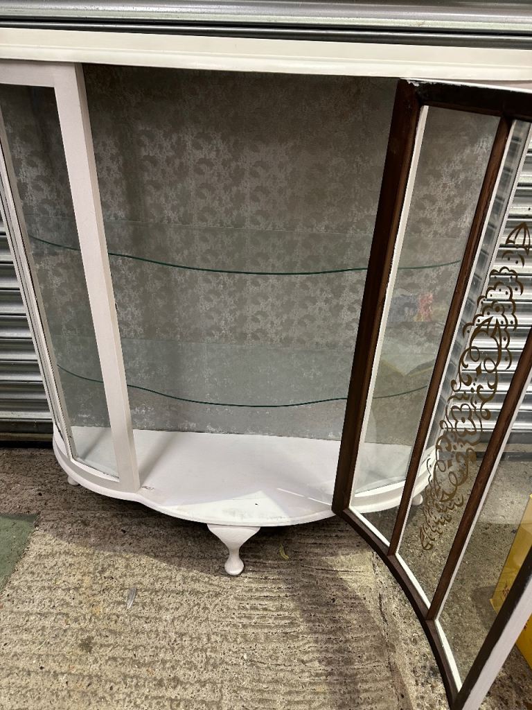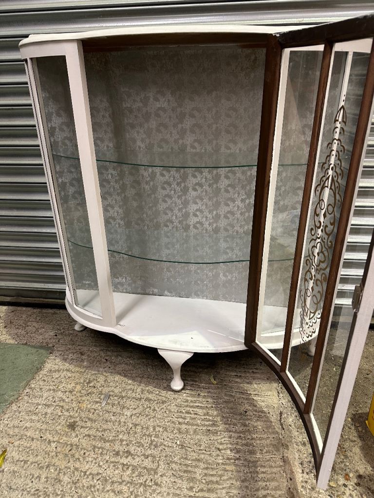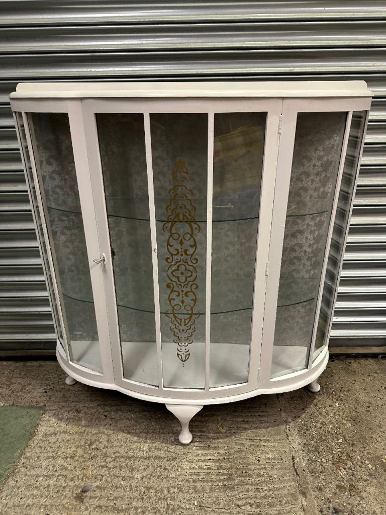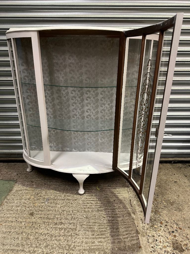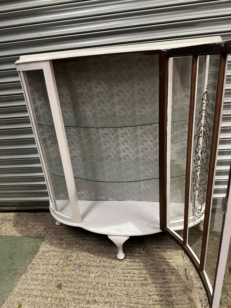 Vintage retro white shabby chic mid century curved glass display cabinet MCM