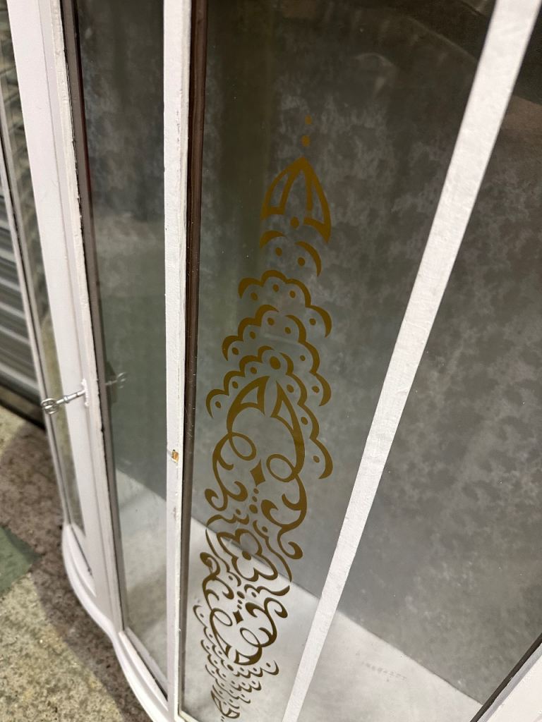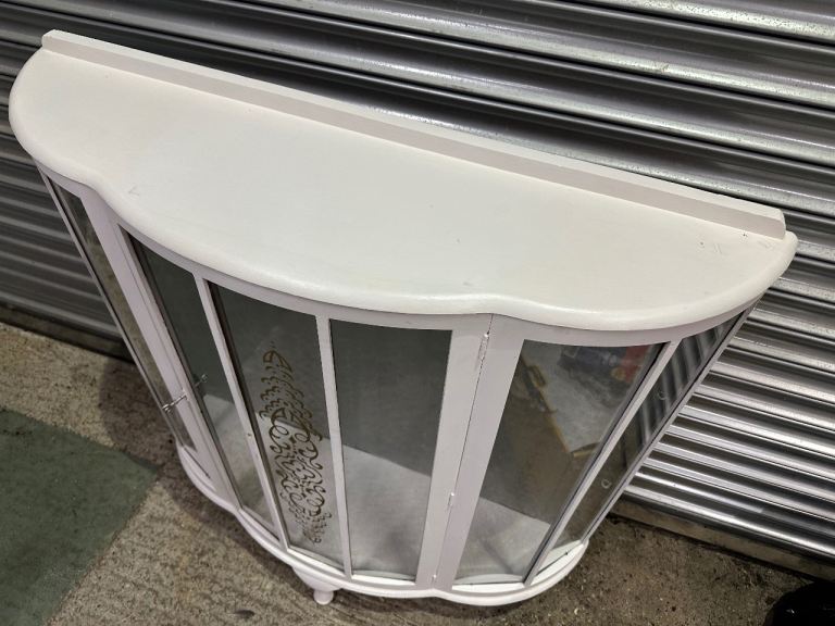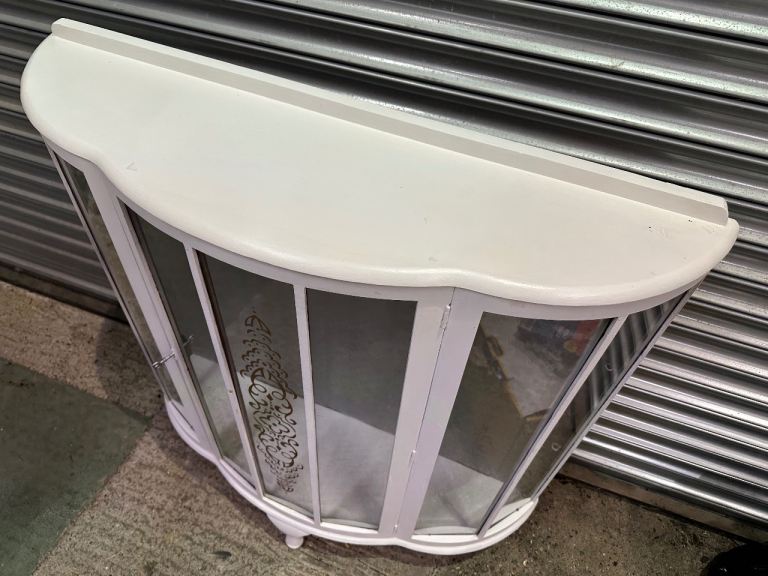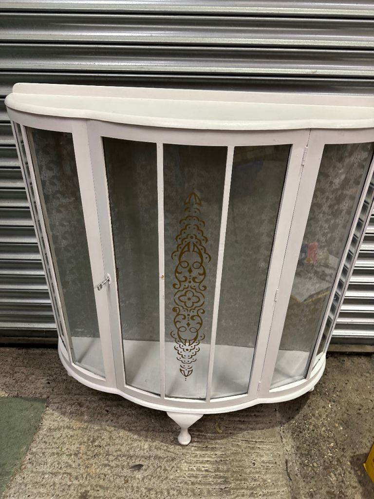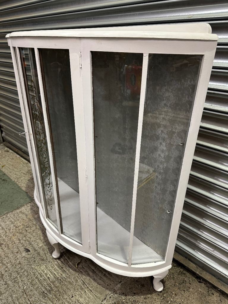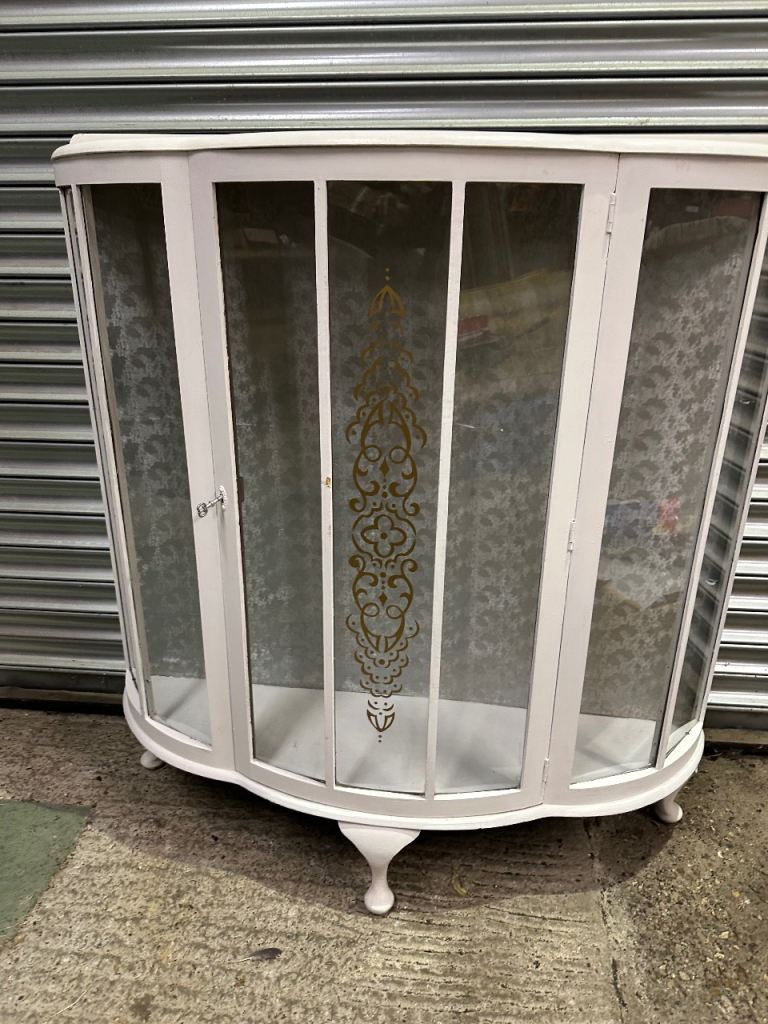 Vintage retro white shabby chic mid century curved glass display cabinet MCM
