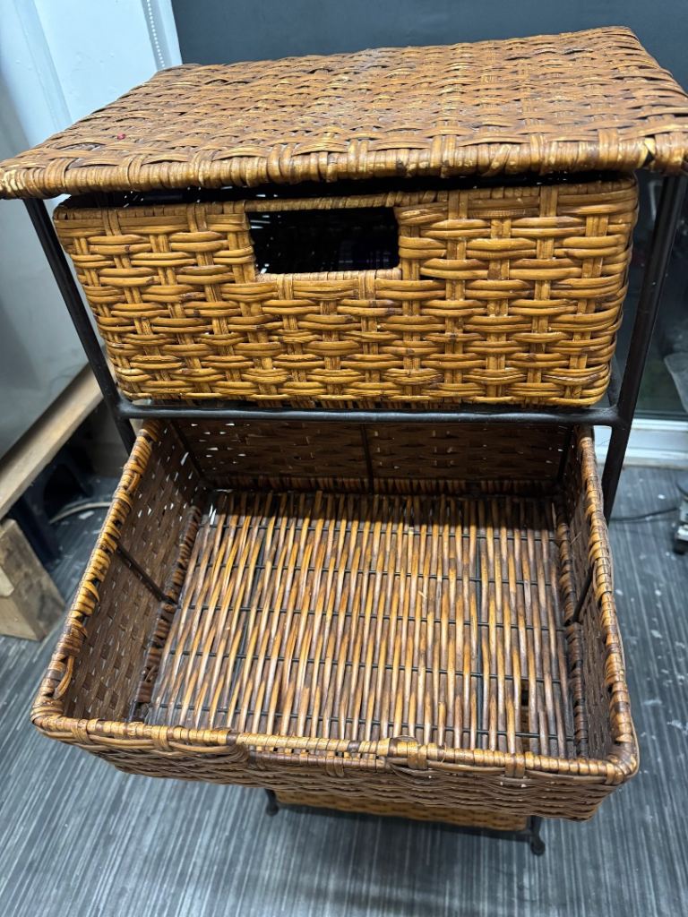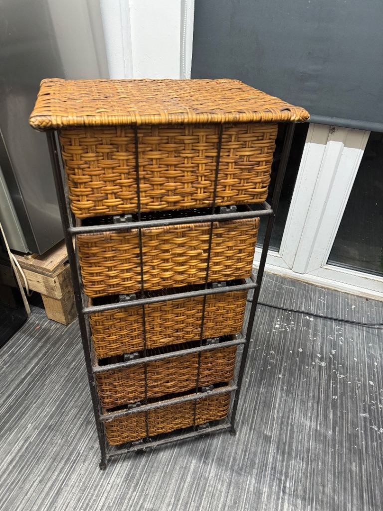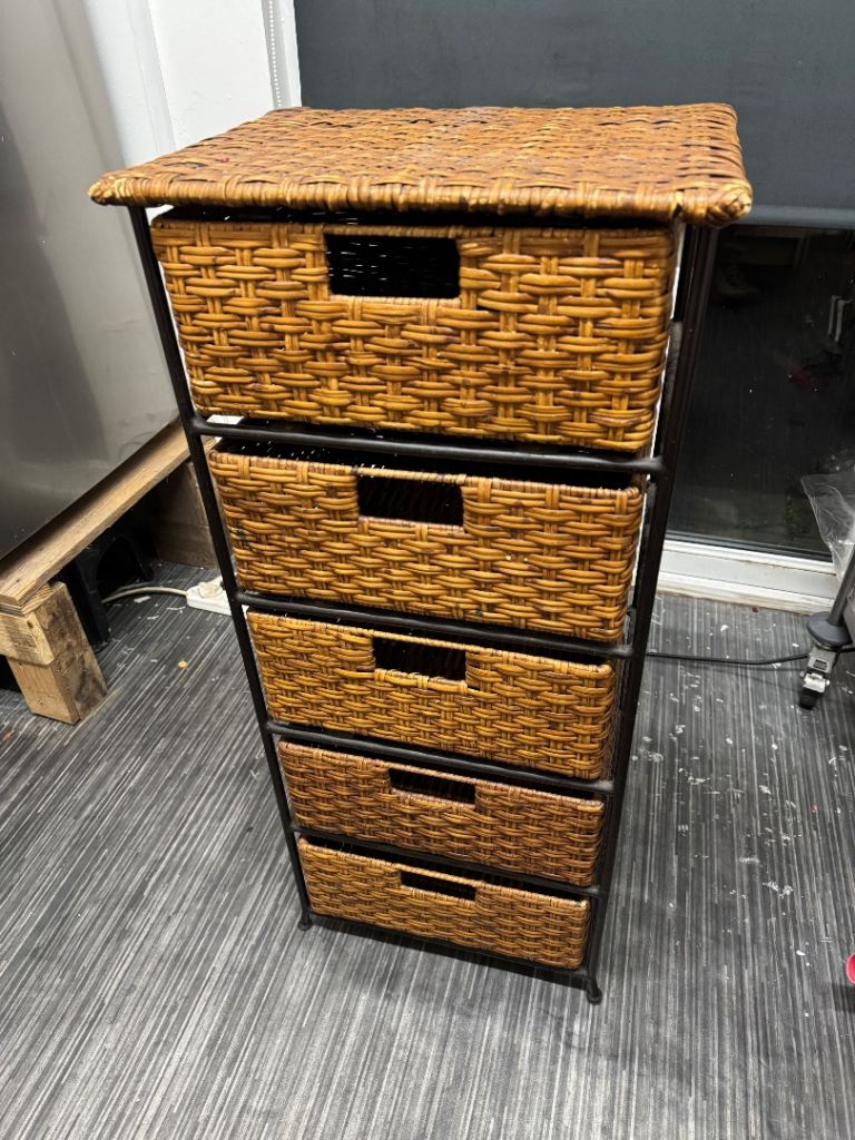 Five-drawer wicker storage unit with metal frame.