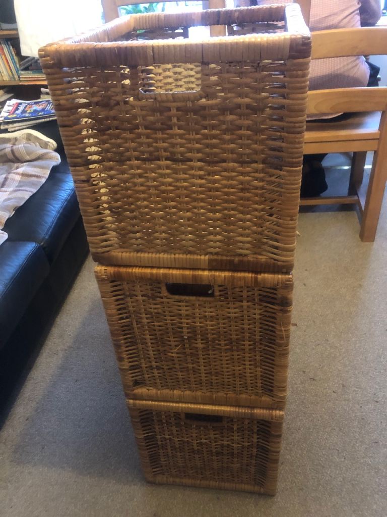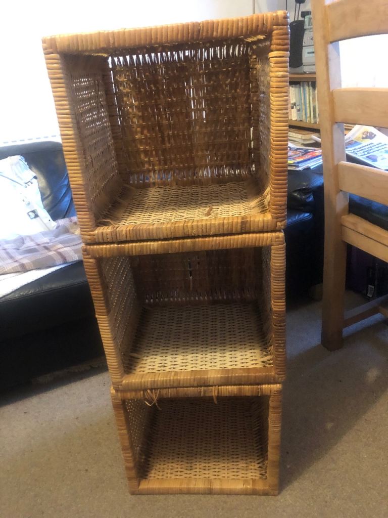 Natural wicker storage cubes 32 x 35 x 32 cm high. Can be stacked as shelving or used freestanding. Useful additional storage for toys, books, craft supplies etc. Only £15 each or £40 for all three.