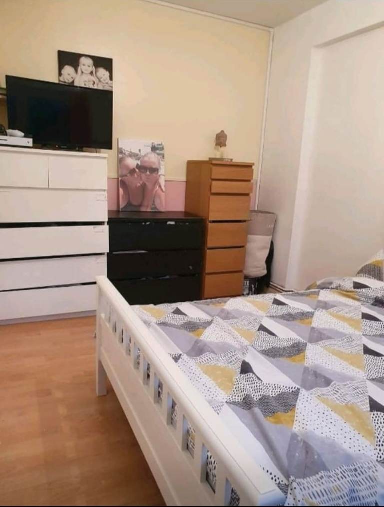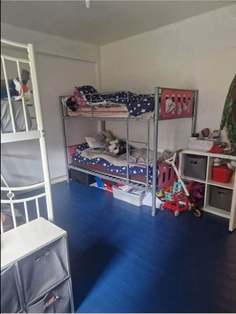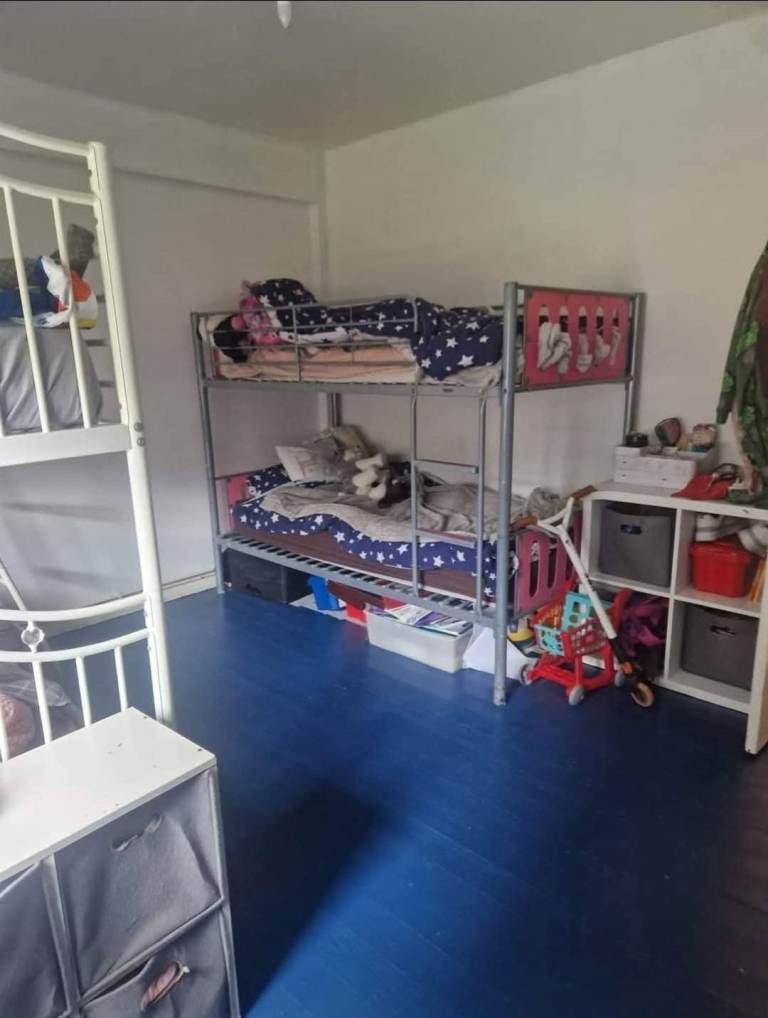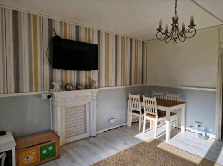 The living room is large enough to house table and chairs( living room has been redecorated.The kitchen is a decent size. 1 bedroom is a master bedroom with a storage cupboard and a built in wardrobe, the other bedroom is a double. The communal area can be used for bbqs or even a paddling pool/trampoline.
