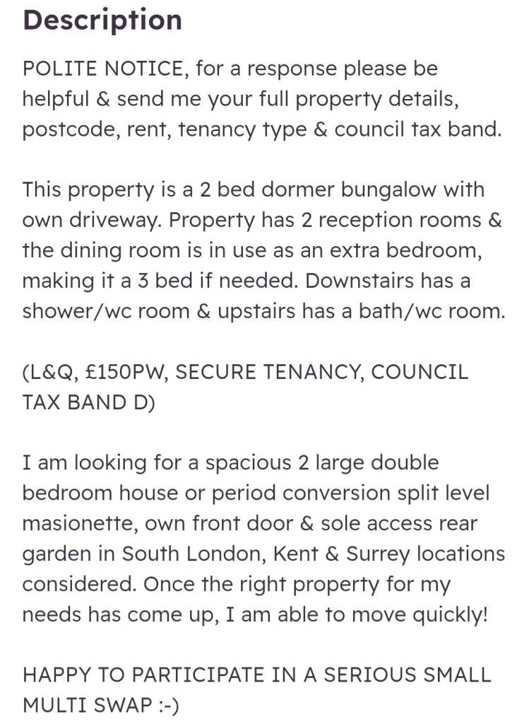 Posting for 3+ years2/3 bed dormer bungalow, own driveway & x2 wcs swap for 2 bed house.