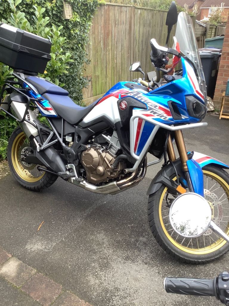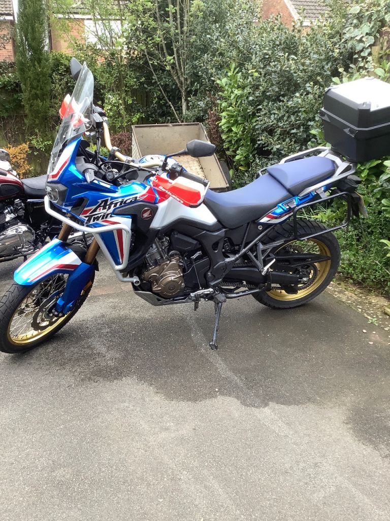 For Sale my beloved Africa Twin. 2019 ( not DCT), low mileage just broke the 10k mark. New tyres, new pads, recently serviced, honda standard exhaust fitted but I also have a SP engineering performance exhaust that can go with it, bark buster lever protectors, luggage, original tool box. The original lever protectors are included in the sale, 2 x keys service book, maintenance book V5 present. This is a superb bike worth a look. It’s currently on the bench having a clean purely because I’m a bit particular about my bikes. It’s a cracking bike, hasn’t been abused ( I’m in my 60s). Any questions let me have them. Just sailed through another M.O.T for another 12months.