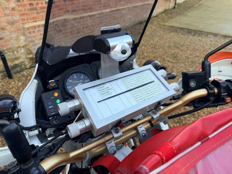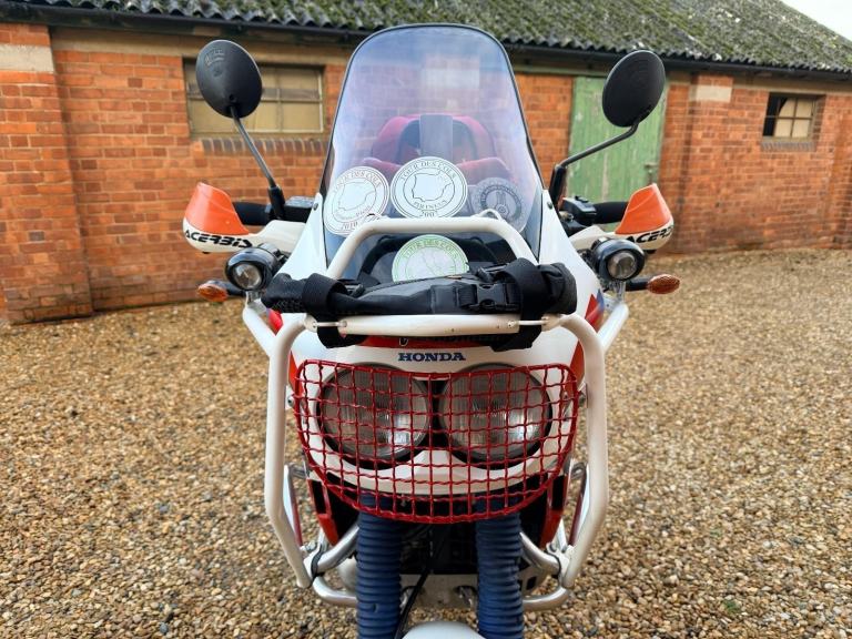 The bike benefits from a thoughtful selection of period-appropriate and functional upgrades that enhance its usability while remaining true to the Africa Twin’s original purpose. These include a Laser Pro exhaust, full wrap-around crash bars, hand protectors, running lights, a front lamp guard, fork protectors, and a comfortable seat pad. Practical touring additions such as a tank cover, tank bag, rear bag with frame support, and a map box with integrated lighting make it exceptionally well suited to long-distance riding.