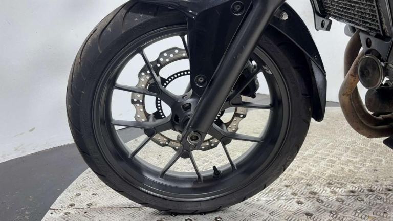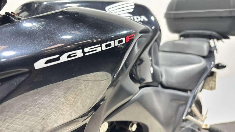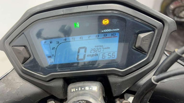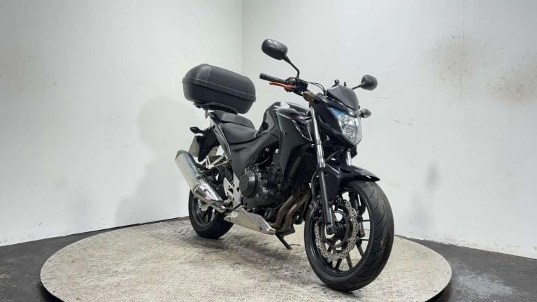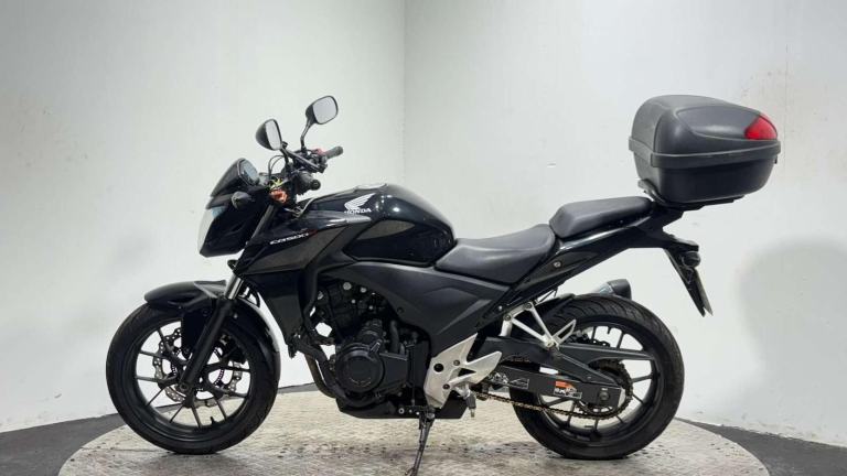 2014 Honda CB500F showing 29,207 miles and in good running order. A popular A2-compliant 500cc twin that has been unused for a couple of years and will need a service, MOT and some light mechanical attention. Fitted with a top box and in generally tidy condition for its age. Fuel-injected twin-cylinder model producing around 47bhp.