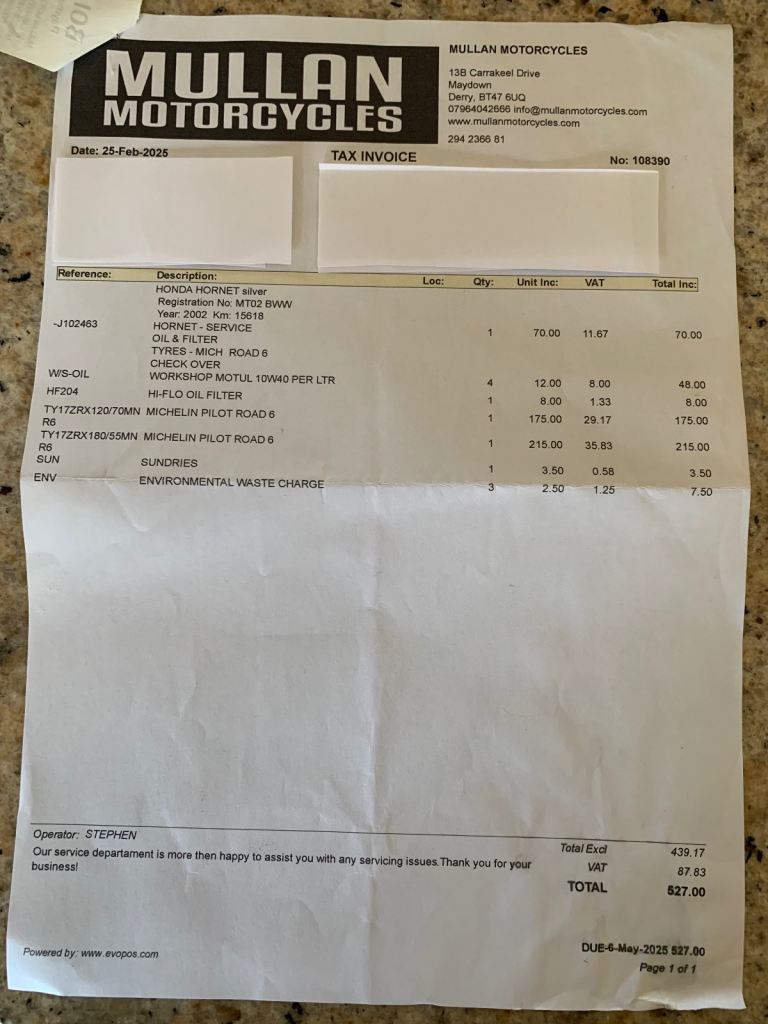 Only 350 miles since last service (Feb 25) where new Michelin road 6 tyres were fitted (over £500 spent)