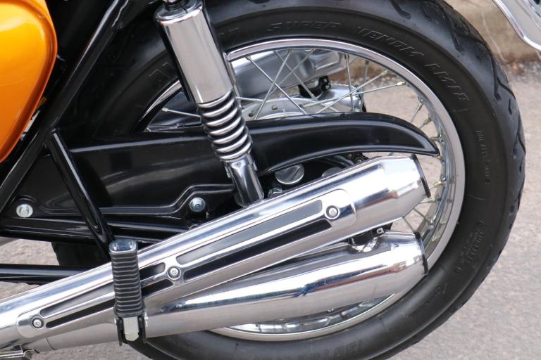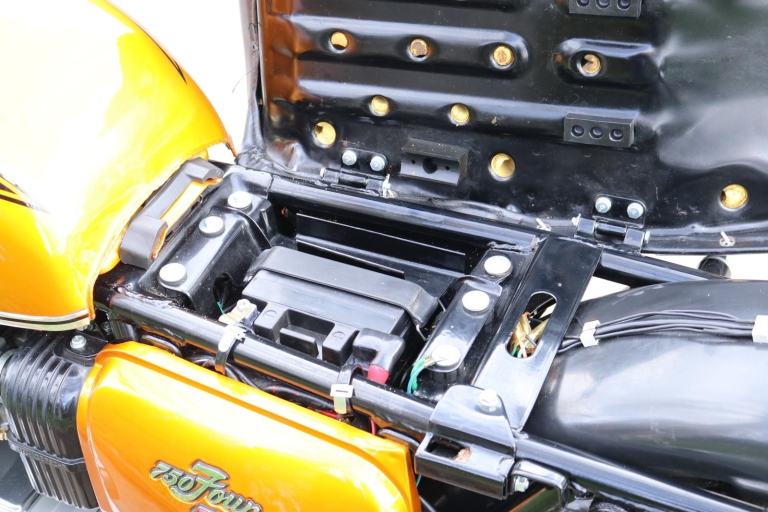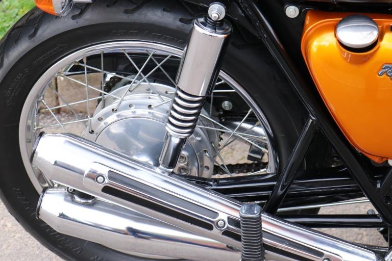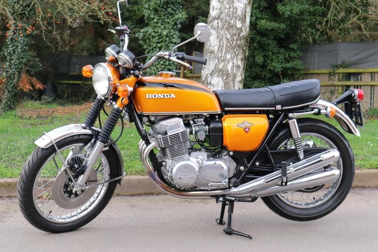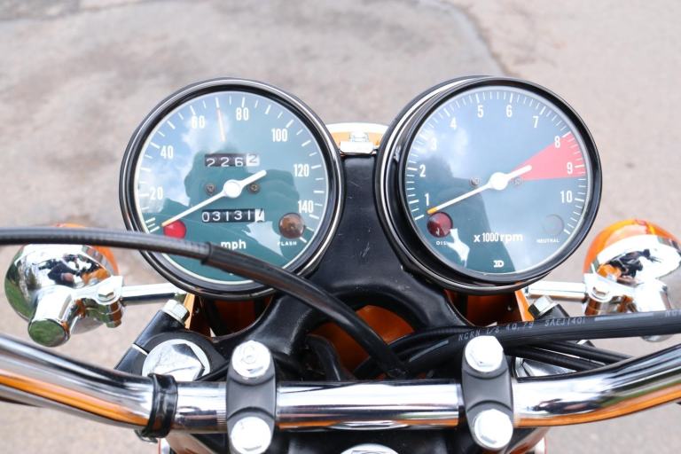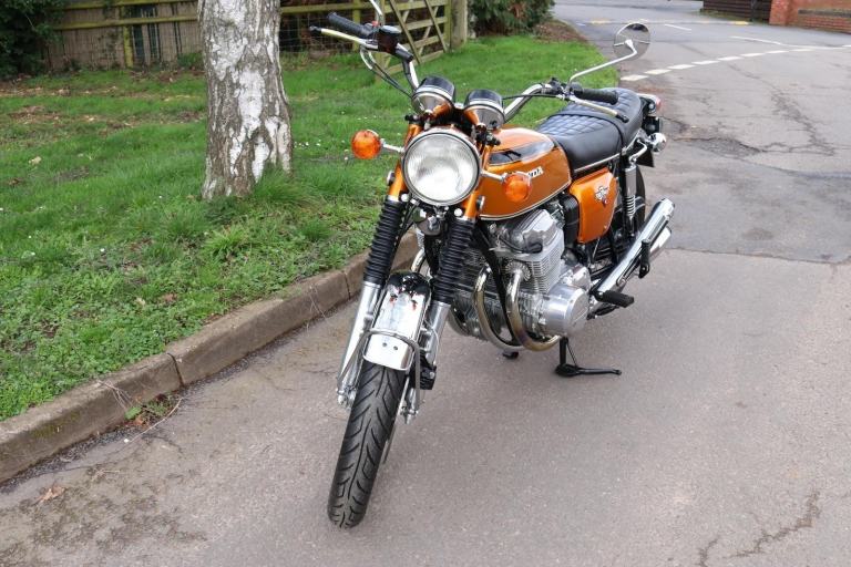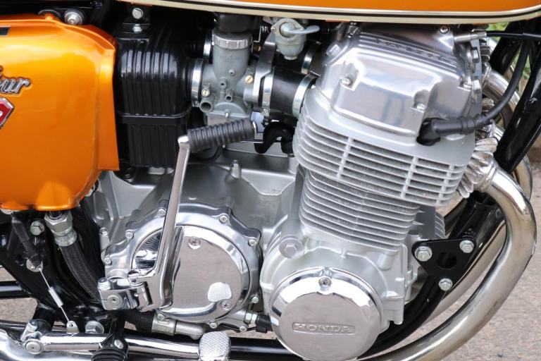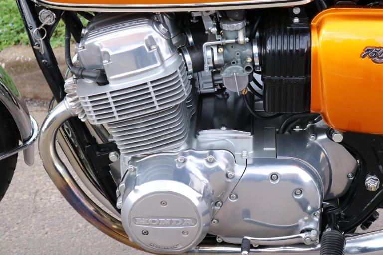 Fresh into stock, this UK Supplied and UK Registered Honda CB750 K1 in Candy Gold. Runs and rides like it looks, superb. Some old MOTs in the file, oldest is back to 2004 when the mileage was 1087 miles, and then it climbs up through the years. Last MOT is 2014 at 2,898 miles and we guess it was laid up then later restored. So mileage of 3131 could be original. A ground up restoration a few years ago including a complete engine rebuild using lots of NOS parts where available. A brand new set of Genuine Honda HM300 pipes are fitted. We are told the original UK motorcycle was in fairly rough condition and the frame was rusty by the centre stand (normal for a UK version) so a New Old Stock frame was used and a New Old Stock set of cases were also used. The owner kept the old units, but an unscrupulous scrap merchant took them away. The down side, the engine or frame don't carry a number. Not a big deal, it's not a legal requirement, as the V5C has both numbers on. The good news, if this bike had the numbers, it would be £12,000. So a huge saving. If you are desperate for numbers and want a K1 (which is probably the best CB750 out of them all) we have a Candy Ruby Red one coming from the US in a few months, but that will be £12,000. So grab a bargain, but you need to be quick, this won't be here for two long.