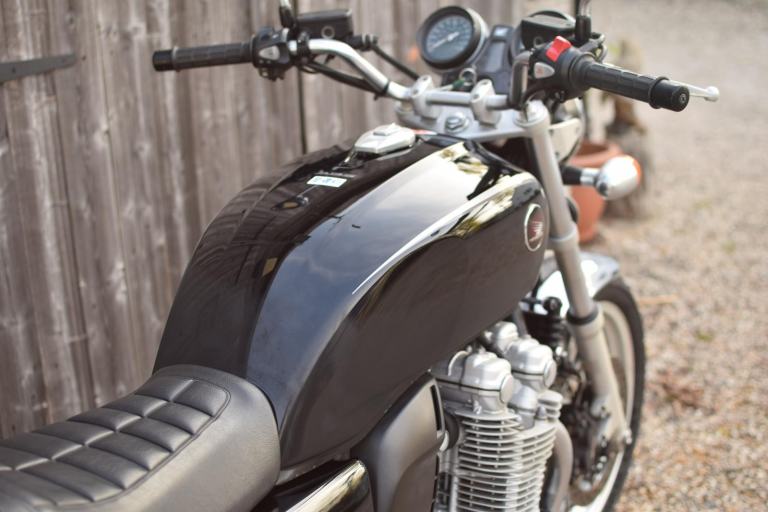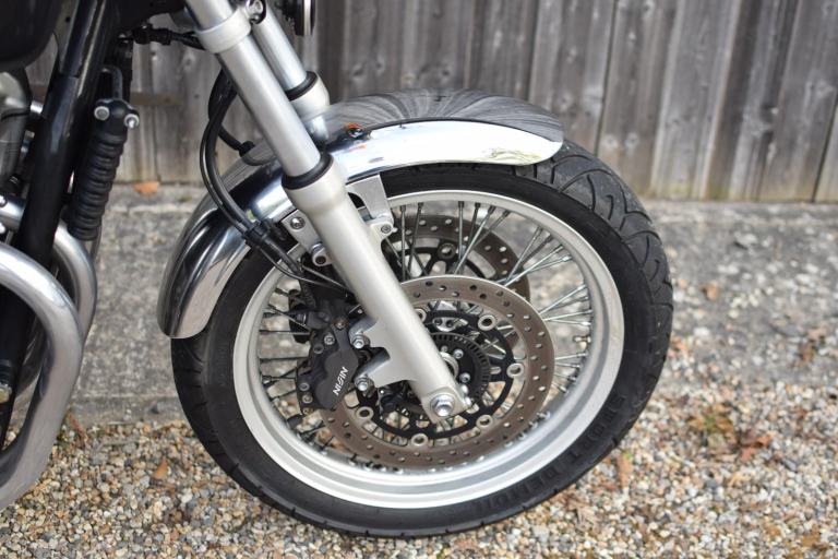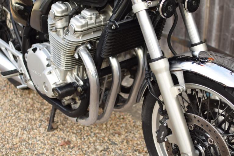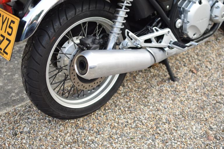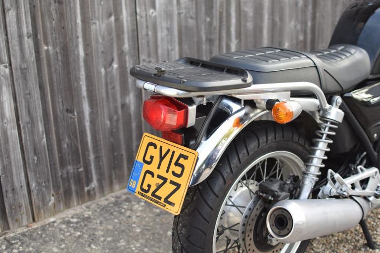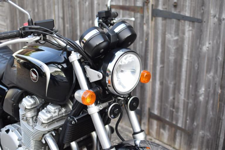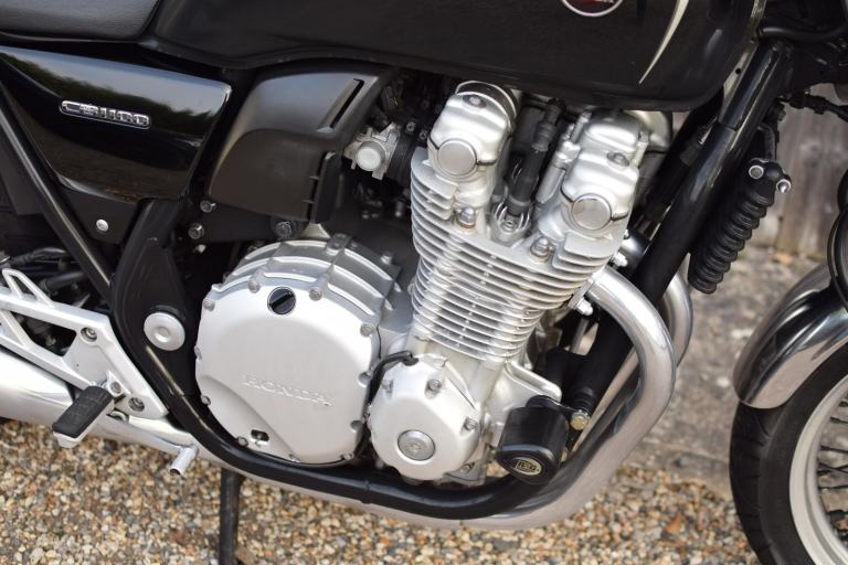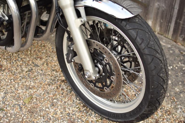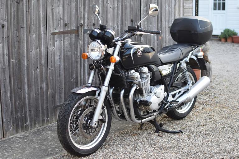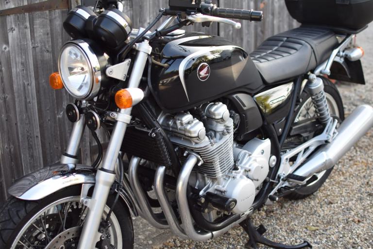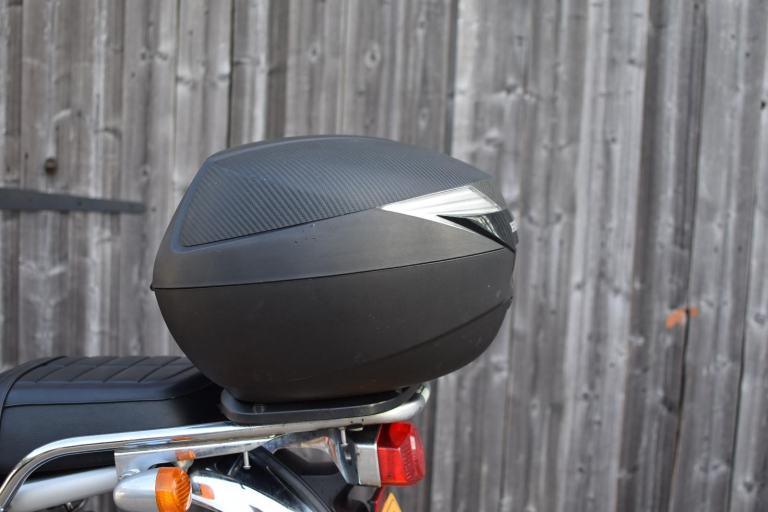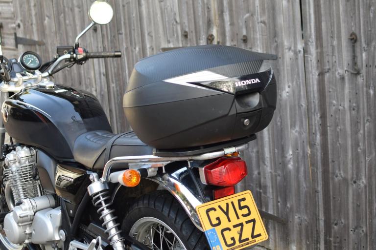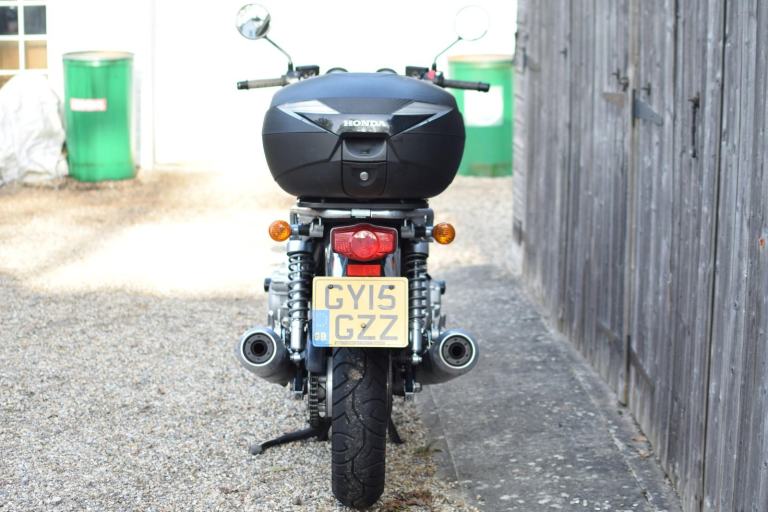 This one is the C-ABS model with combined braking effort and benefits from a Honda luggage rack, Honda quick release top box, R&G Aero engine protectors and ever useful factory fitted centre stand.